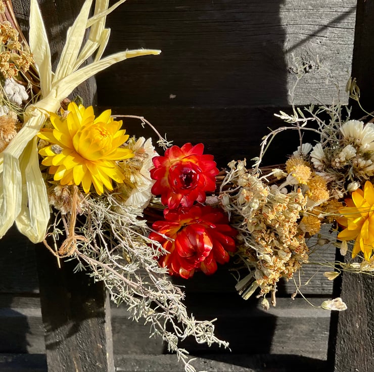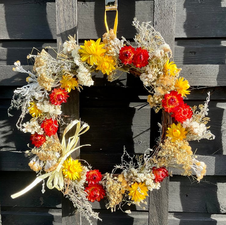 The "Embers" wreath is approx. 30cm in diameter and has Helichrysums, Statice, Thyme and Achillea arranged on a willow wreath base. All in yellow and burnt orange shades like the embers of the fire!