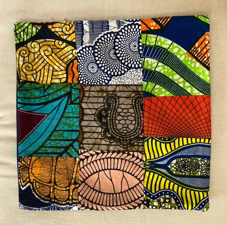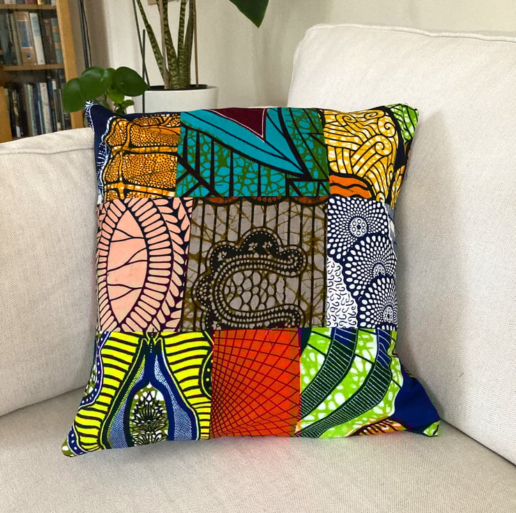 I love the bright colours and patterns of West African fabrics and I think they make wonderful statement patchwork cushion covers.