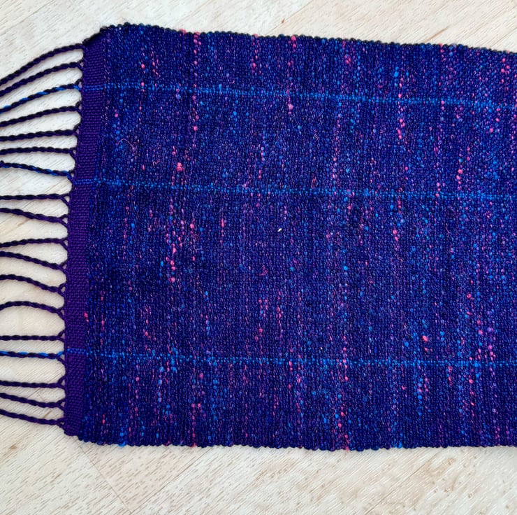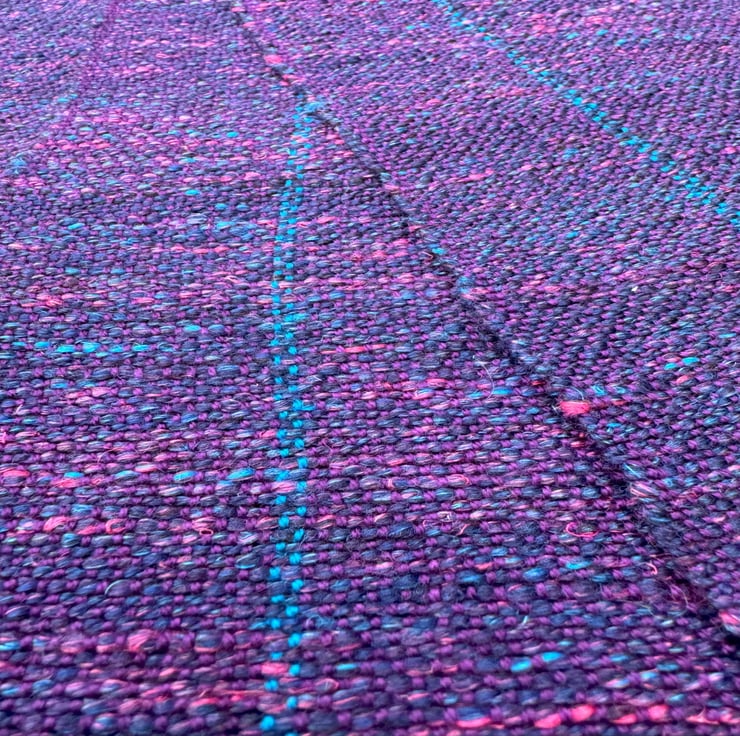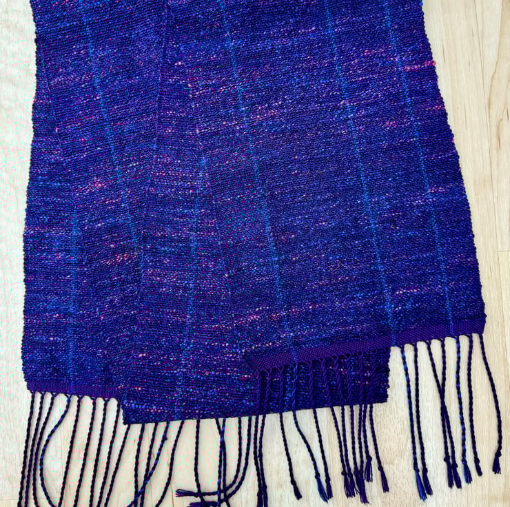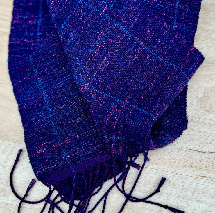 This lightweight hand-woven scarf screams out at you in a beautiful deep purple, flecked with accents of bright pink and turquoise blue. The weft is hand-spun, and comprises 62% merino wool, 25% zwartbles wool and 25% linen. This was then hand-woven onto a tencel warp of amethyst purple, with three very thin (ie double thread) warp stripes of the turquoise blue. The scarf is 147 x 21.5 cm in size (excluding the fringed tassels). Hand-wash carefully at low temperature and lie flat to air dry; the scarf can be ironed at low heat.