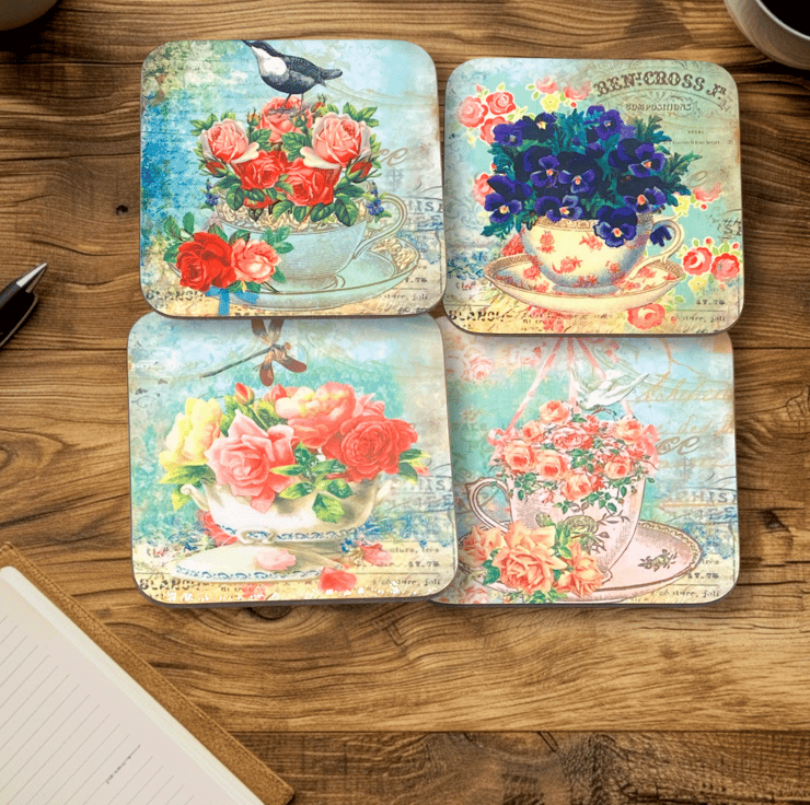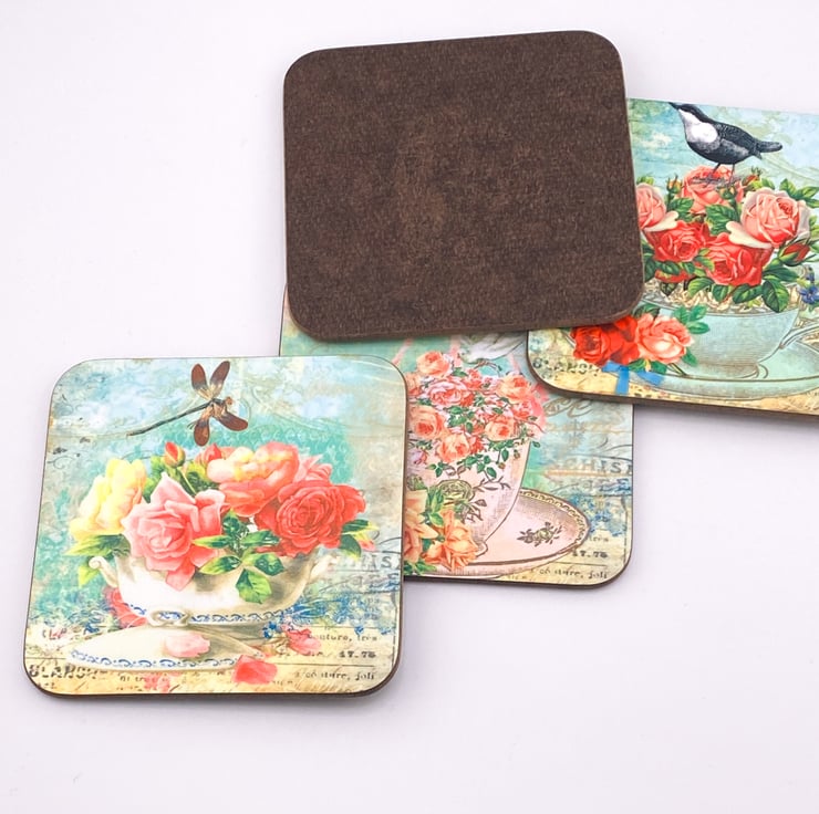 These coasters come in a set of 4, are made from hardboard with a shiny surface, and printed in my own craft studio.