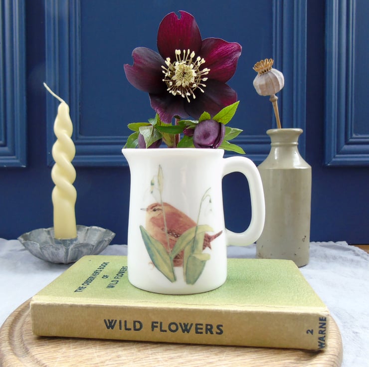 A cute mini jug featuring my watercolour painting of a cute wren amongst the snowdrops, the perfect size for tea for two or using as a bud vase to display a few cut flowers from the garden at the breakfast table.