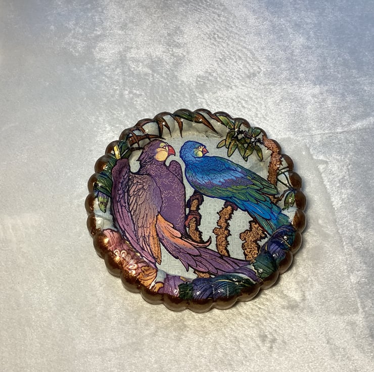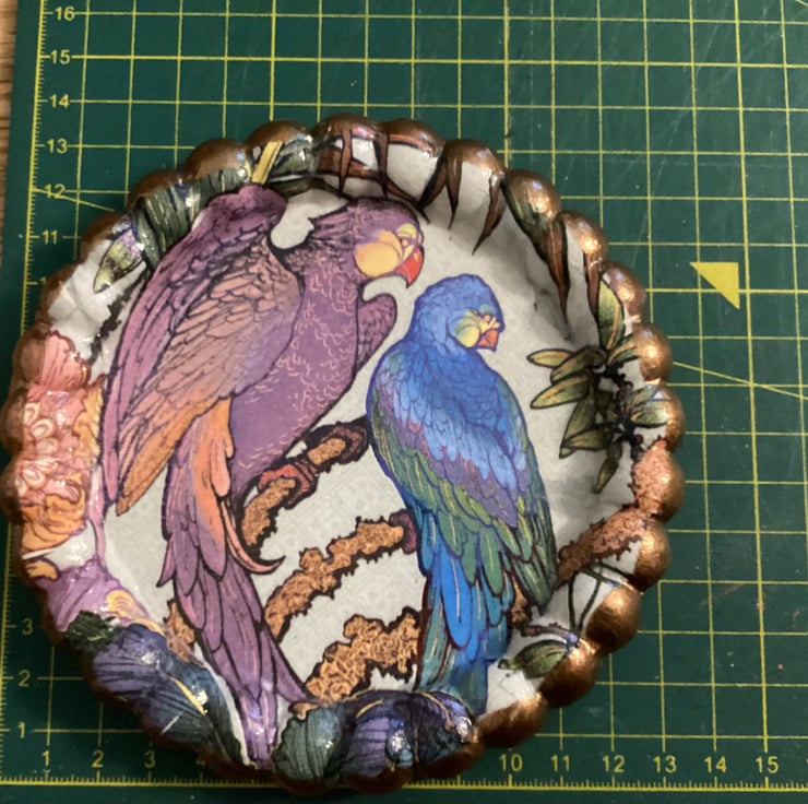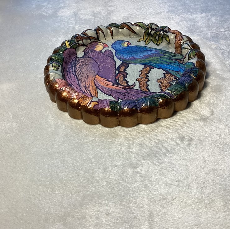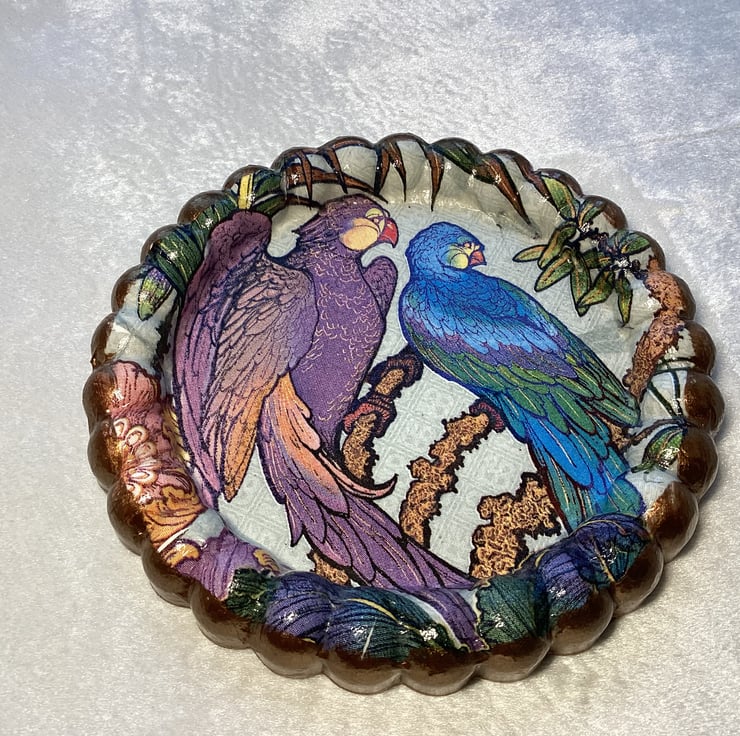 Made from Plaster of Paris, decoupage , vanished for protection.