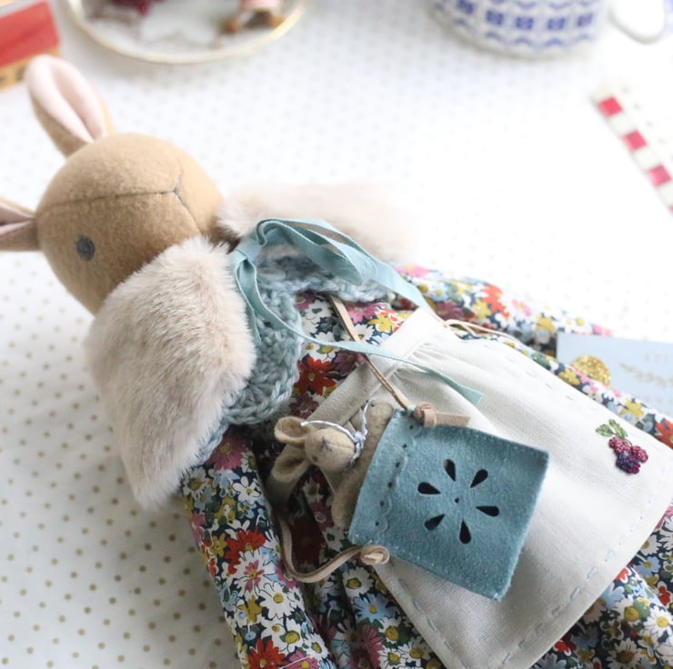 Her accessories include a tiny leather bag, hand punched with a daisy design and containing a baby bunny with a ric rac tie.