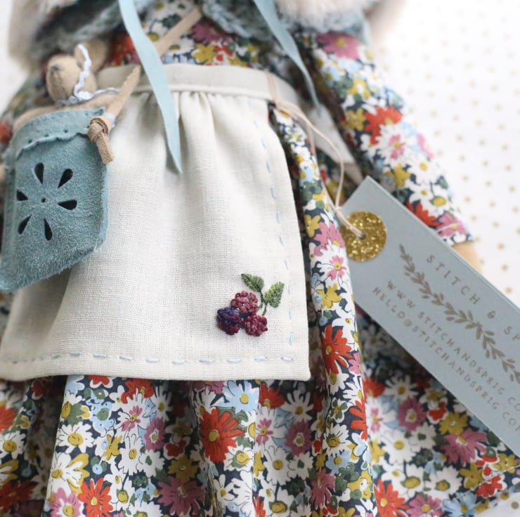 Her apron is made from cotton/linen fabric and embroidered with tiny running stitches and a little blackberry design.