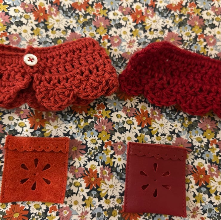 Her cape is crocheted from lovely Rowan yarn in red and fastened with a vintage button.