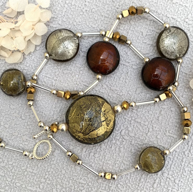 This gold and bronze necklace set is made with a collection of lightly patterned foil beads with a 3cm gold patterned focal bead. The main beads are interspersed with hematite cube beads, gold tone glass beads, silver beads and silver tube beads. The set is finished with a pair of matching earrings.