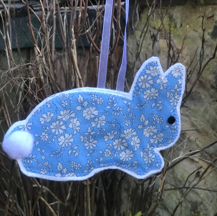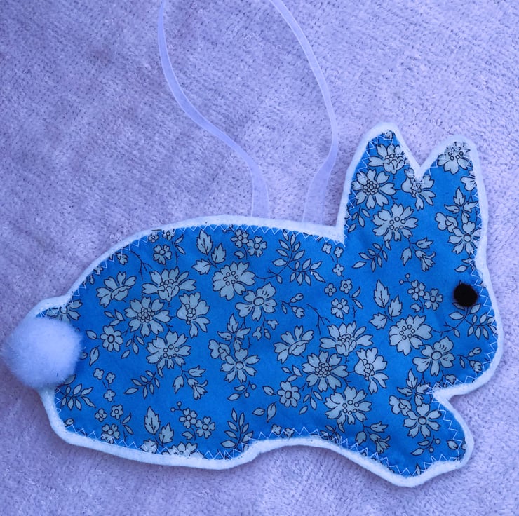A charming Easter bunny rabbit in Liberty fabric and felt. The bunny has a ribbon to hang and is in a pretty blue and white fabric