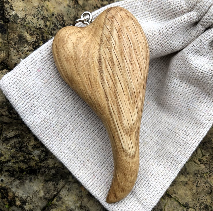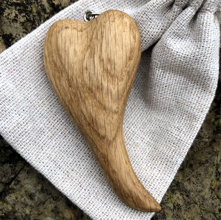 Crafted with care from reclaimed oak, this beautifully hand-carved pendant offers a unique touch of nature to your jewellery collection. Measuring 5cm in height, 4cm in width, and 1.5cm in depth. This pendant is a one-of-a-kind piece with its own distinctive character. It is satisfyingly tactile and comes on an 18-inch black waxed cotton cord, finished with a silver lobster clasp. The pendant is thoughtfully presented in a drawstring hessian bag (8 x 10cm), making it a perfect gift for someone special or a treat for yourself.