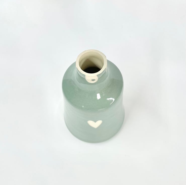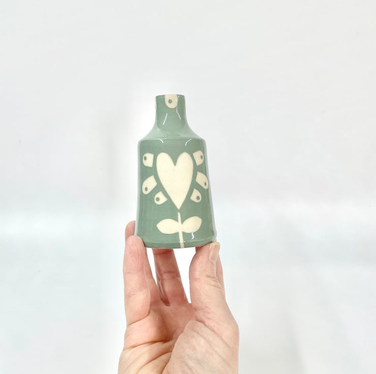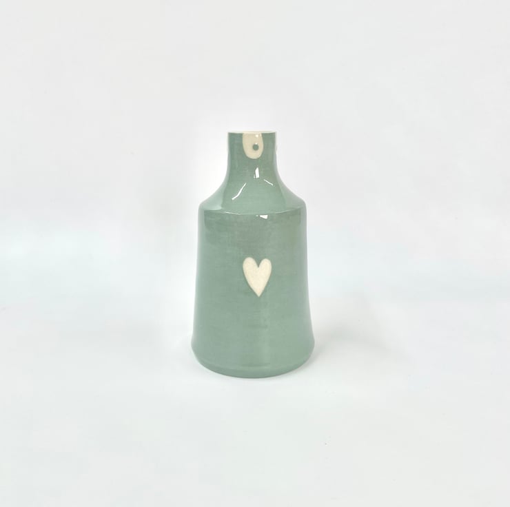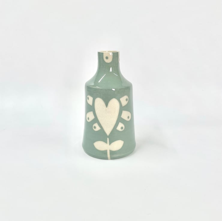 This is a soft pale turquoise vase. Thrown on the wheel, I then decorate with a coloured slip over stencil shapes that I cut from paper, before peeling them off to reveal the heart flower design. It’s finished with in a clear glossy glaze, making a durable keepsake.