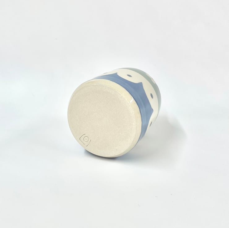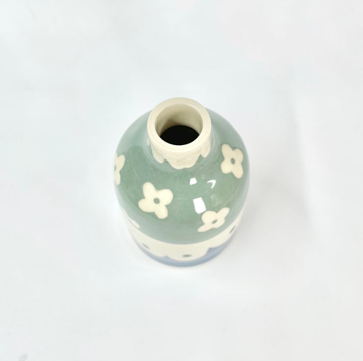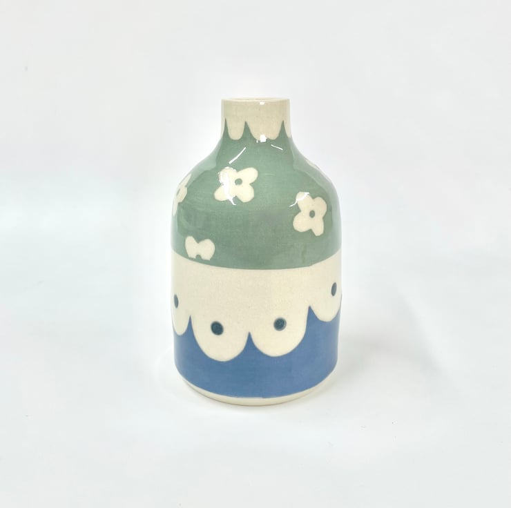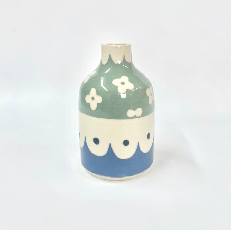 This is a pretty blue & pale turquoise vase. Thrown on the wheel, I then decorate with a coloured slip over stencil shapes that I cut from paper, before peeling them off to reveal the frilly flower design. It’s finished with in a clear glossy glaze, making a durable keepsake.