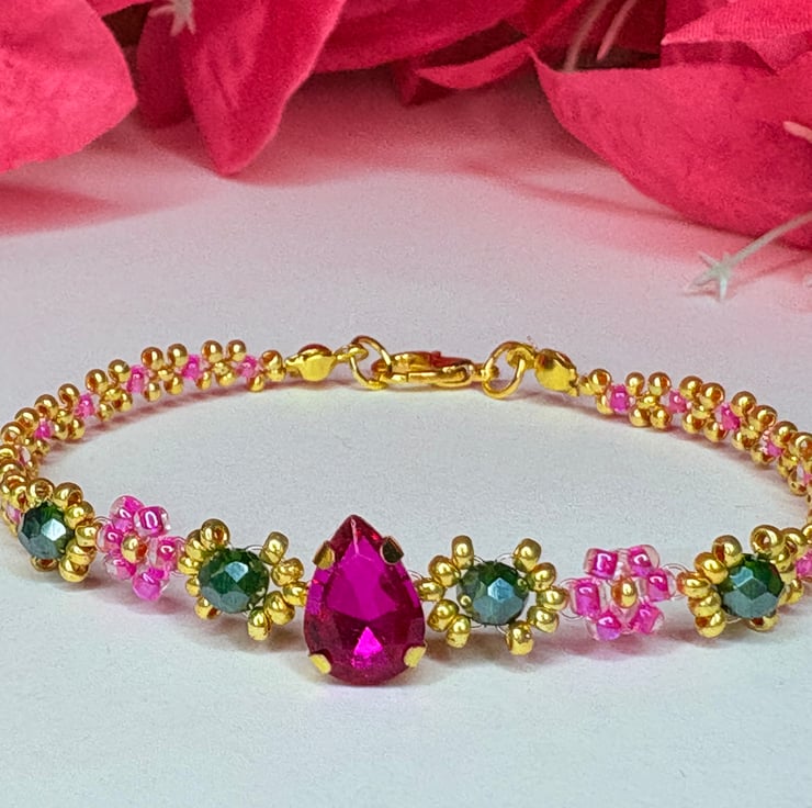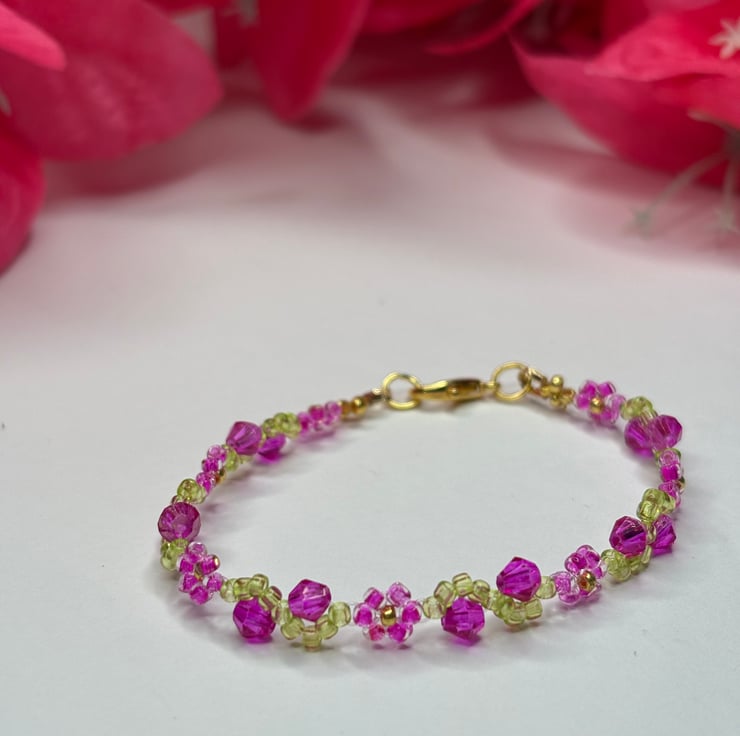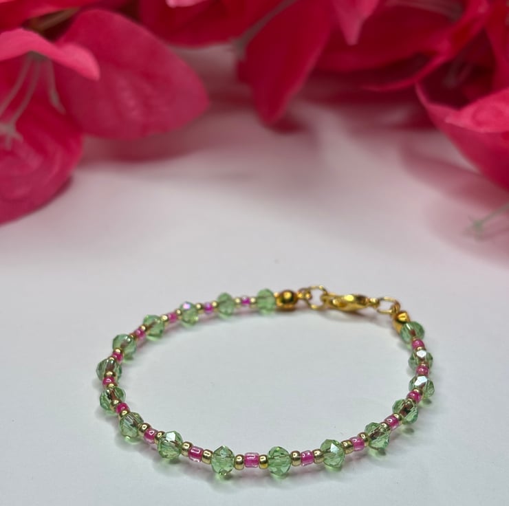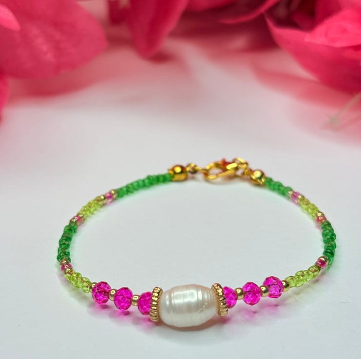 Inspired by the vibrant bougainvillea of the Generalife, this set of five bracelets captures the essence of an Andalusian garden in full bloom. Delicate white pearls with a lustrous finish bring an elegant touch, while green seed beads evoke the lush foliage. The fuchsia pink crystals shimmer like the vivid flowers basking in the sun, and gold accents add a warm glow, tying everything together.