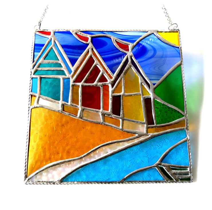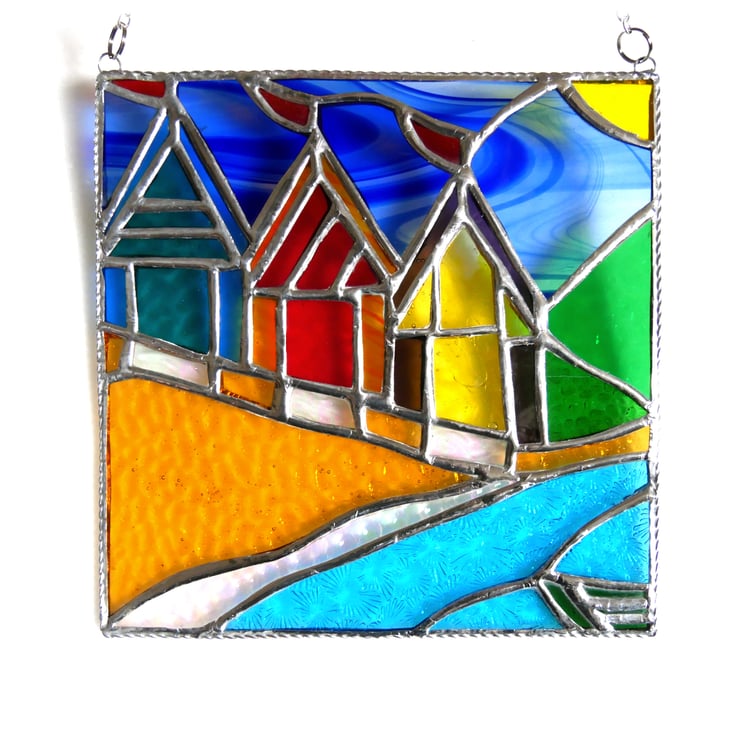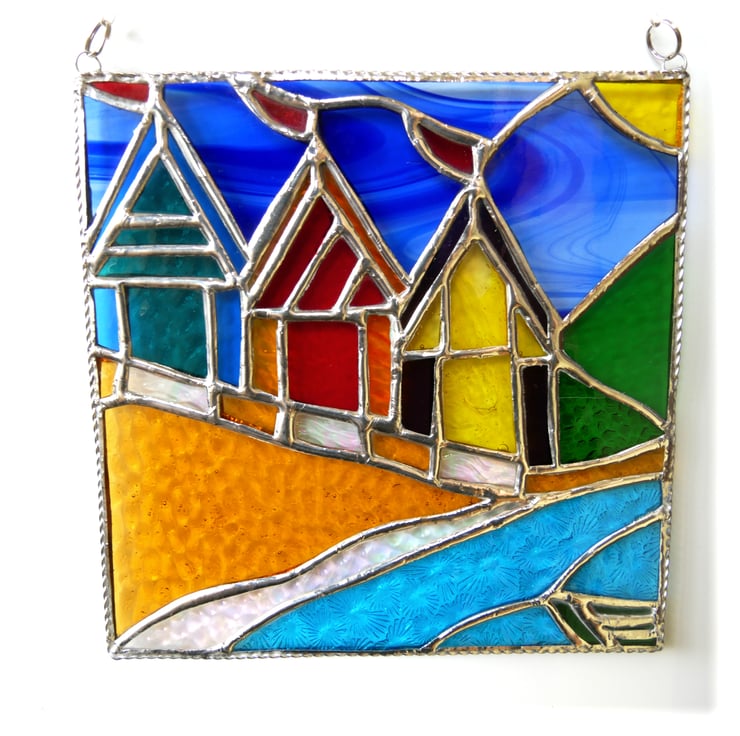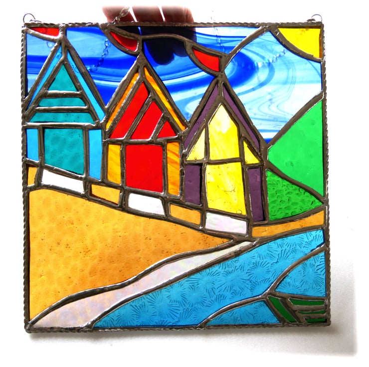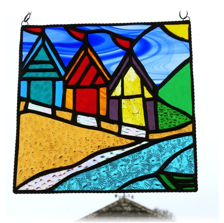 It is a 'picture' of three bright, cheerful beach huts on a golden sandy beach by a shimmering turquoise sea.