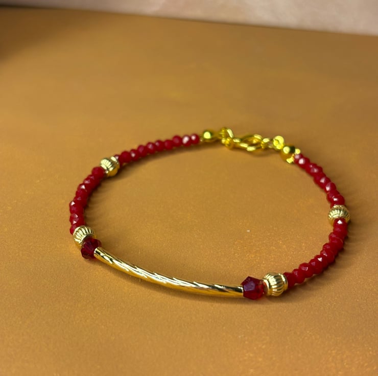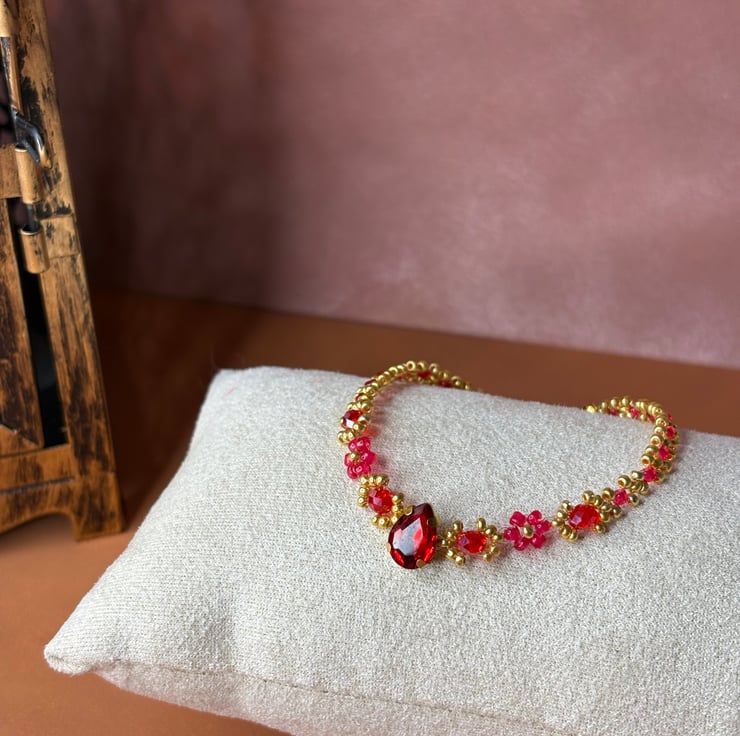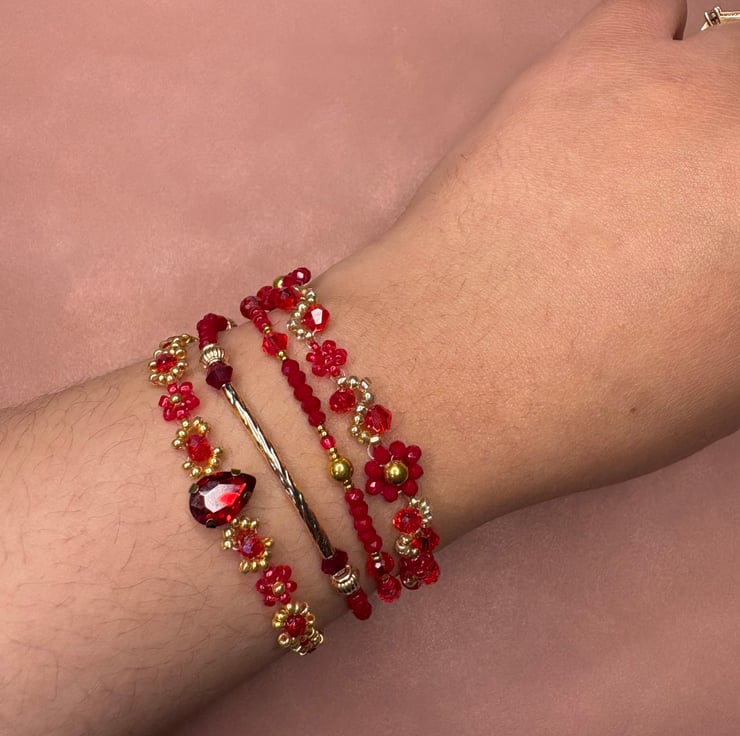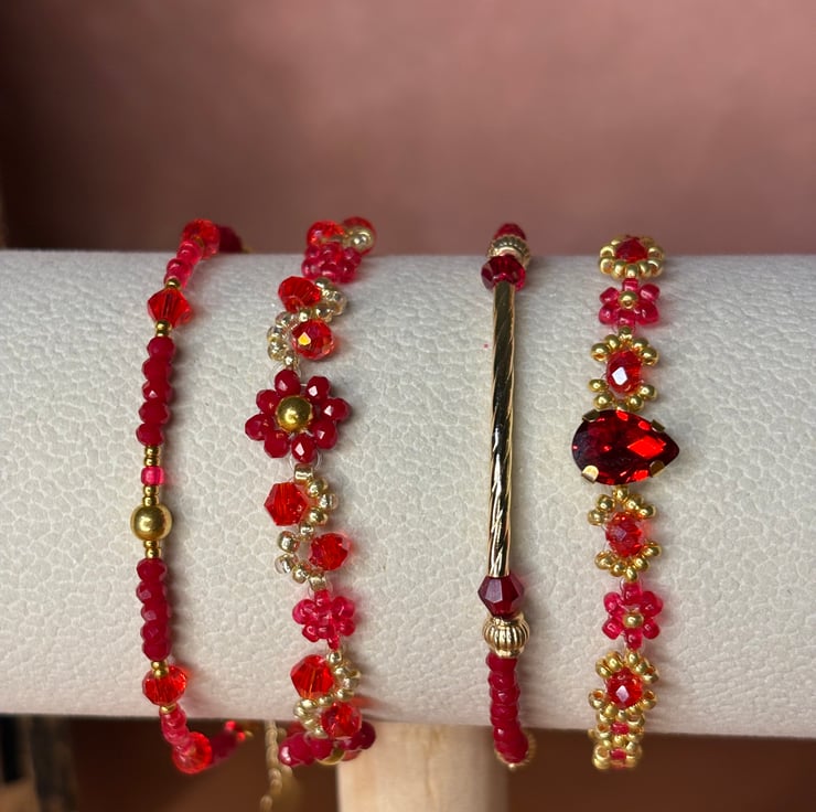 This set of four bracelets blends the richness of deep red with the brilliance of gold, accented by sparkling crystals that catch the light with every move. Floral motifs in red pay homage to the flowers Flamenco dancers wear in their hair, adding a feminine and bold touch. Two bracelets are simple and delicate, perfect for layering, while the other two are more intricate, reflecting the elegance and complexity of Flamenco. Worn together, they make a striking statement, but they can also be styled separately for a more subtle look.