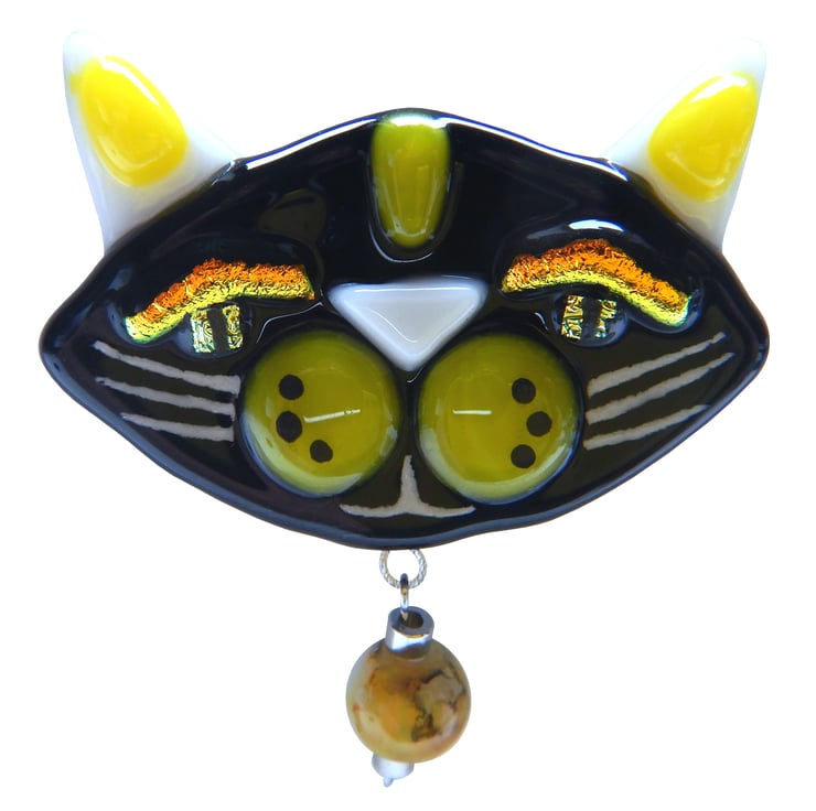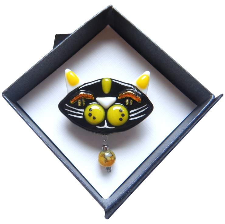 This Handmade Fused Glass Cat Brooch is created by GlassMad in Scotland. It features a unique design and is hand-crafted with fused glass. Perfect for cat lovers looking for a stylish accessory.