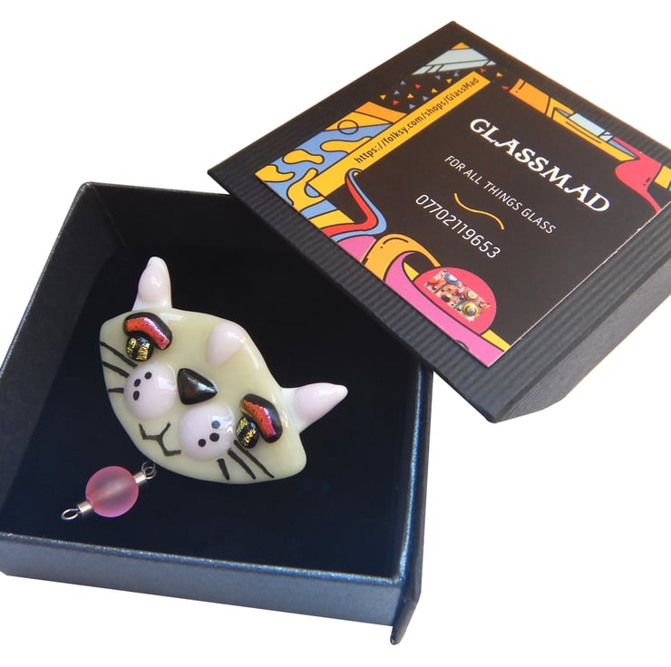 This Handmade Fused Glass Cat Brooch is created by GlassMad in Scotland. It features a unique design and is hand-crafted with fused glass. Perfect for cat lovers looking for a stylish accessory.