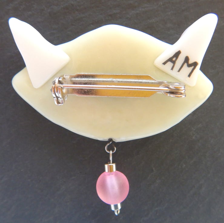 The stainless steel loop, wire, and bead have been fused into the body of the cat, making it impossible to break or fall off. The brooch back is a high quality 3M catch.