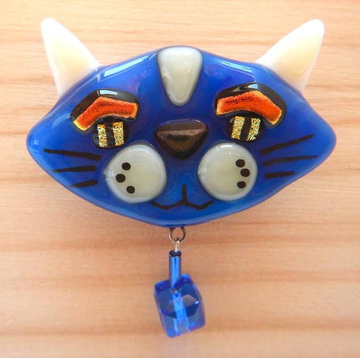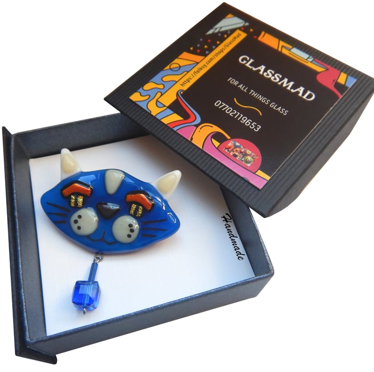 This Handmade Fused Glass Cat Brooch is created by GlassMad in Scotland. It features a unique design and is hand-crafted with fused glass. Perfect for cat lovers looking for a stylish accessory.