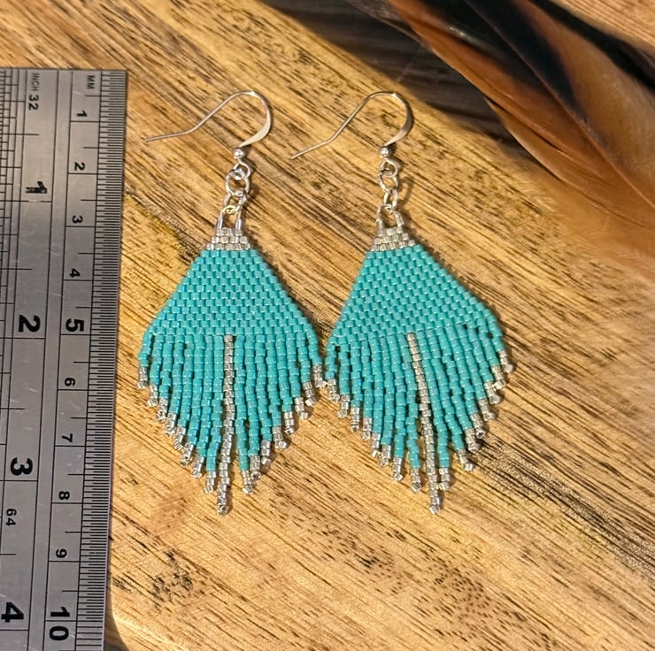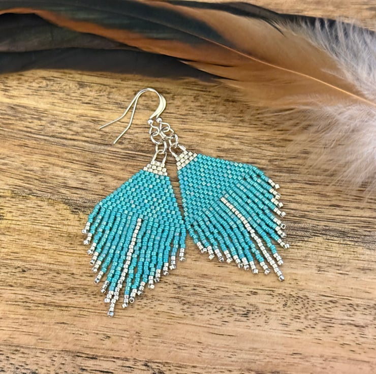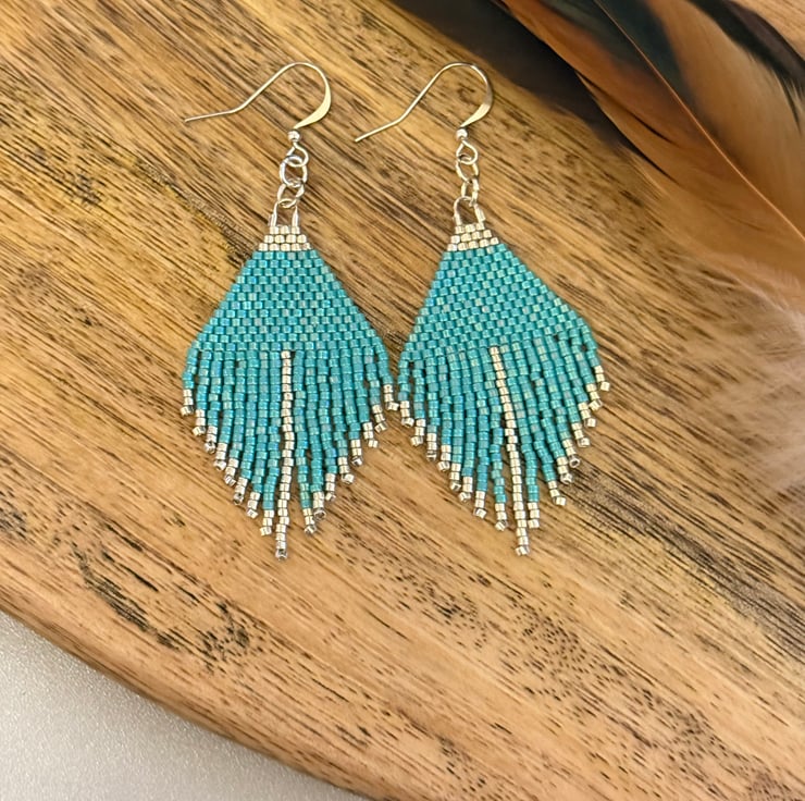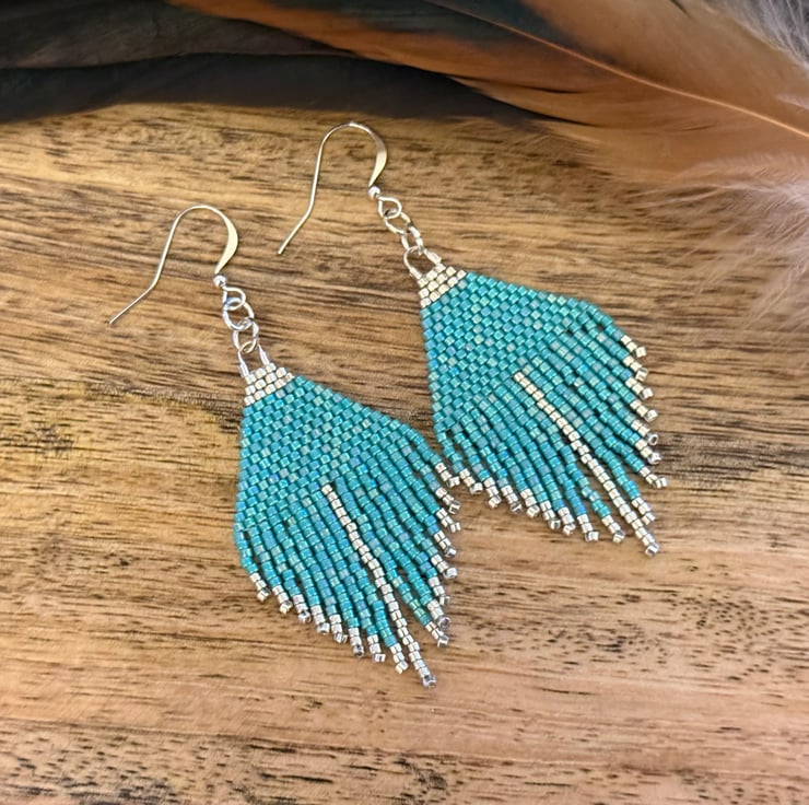 These are handmade earrings made with tiny Miyuki glass beads that are handwoven together. The beads are in bright turquoise and silver colours that are woven into a triangular shape with a short beadwork fringe hanging below.