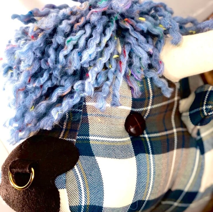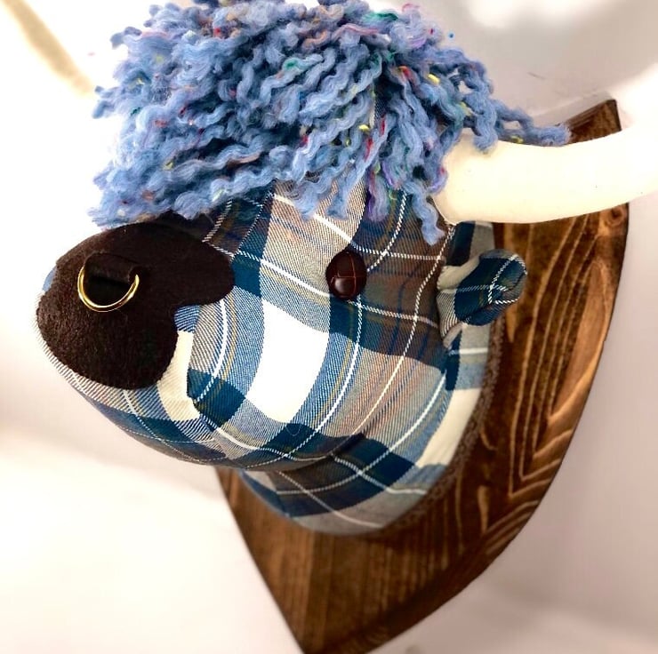 handmade in Scotland by myself and my husband, Mark.The cow head sculptures are made from a combination of Harris Tweeds, wool tartans and Abraham Moon upholstery fabrics. The horns are in unbleached calico and the heads are stuffed with toy stuffing that conforms to British standards. Their eyes are faux leather football style buttons and the cows are attached securely to stained and oiled wooden shields. They can be easily hung on wall using a standard picture hook as they weigh just under 2KG. Each cow has to pass my young sons inspection before they can leave.