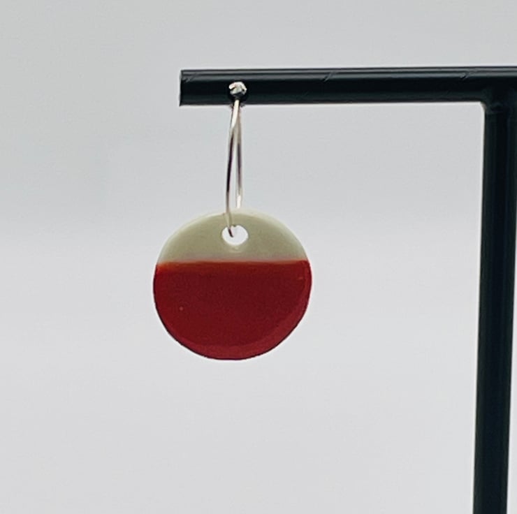 My handcrafted red and white porcelain earrings on sterling silver hoops are hand-painted with red glaze detail. They are so light you don’t know you’re wearing them. A matching necklace is also available in my shop.