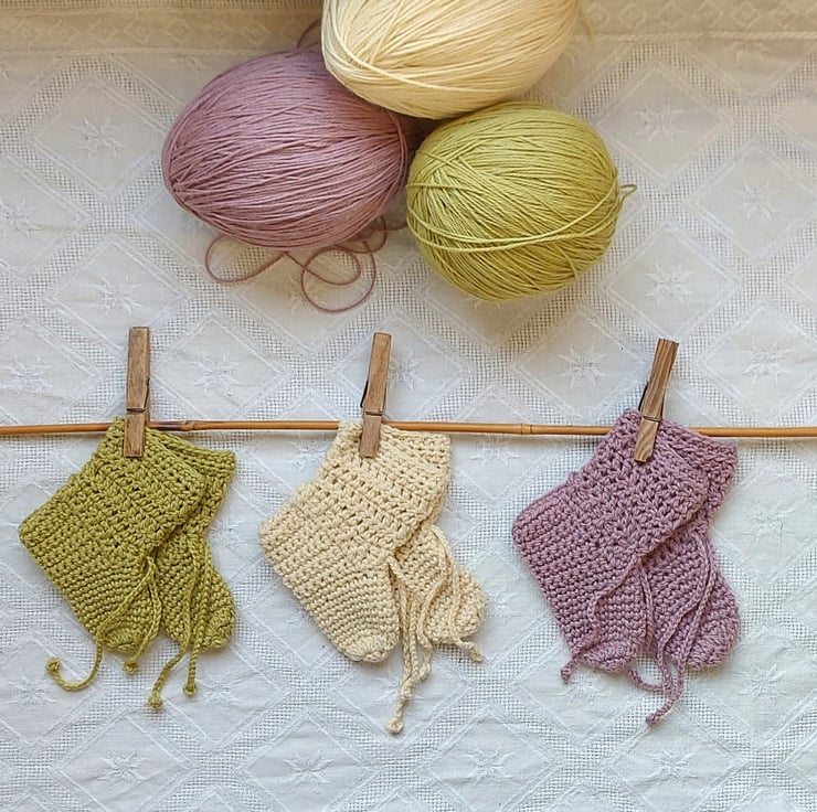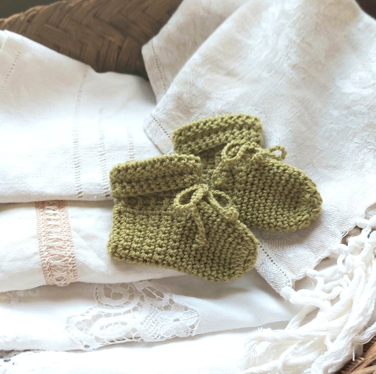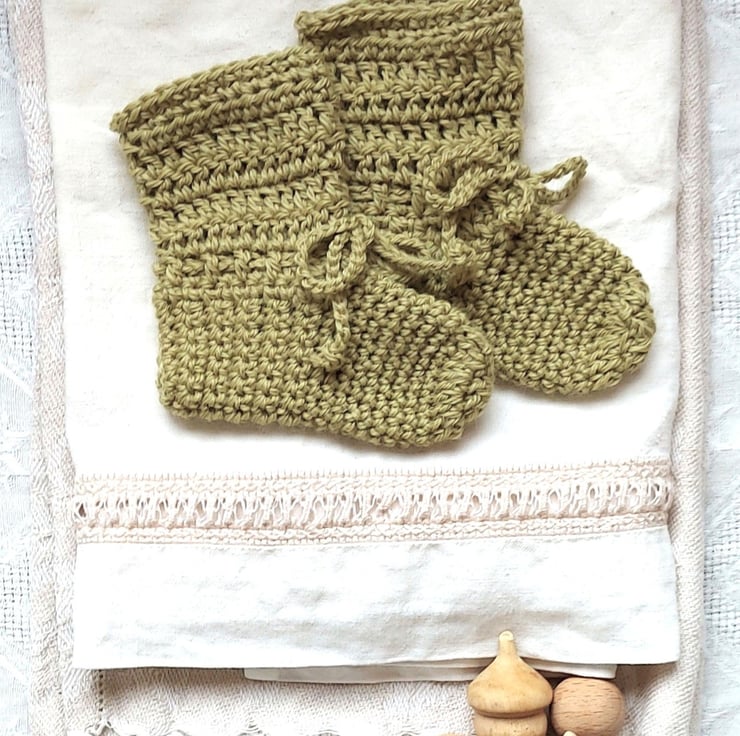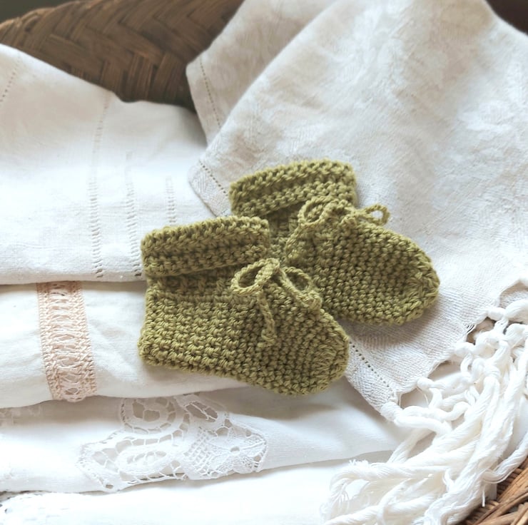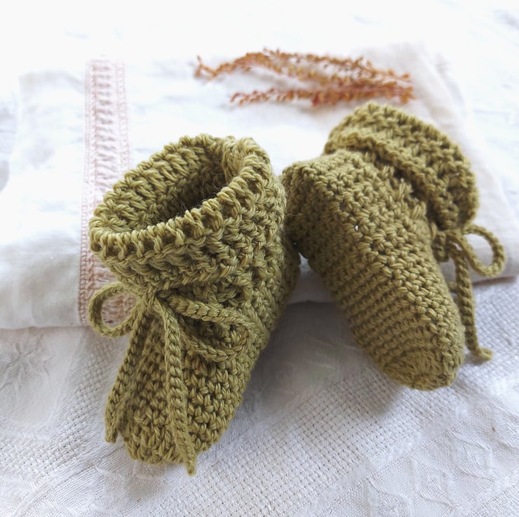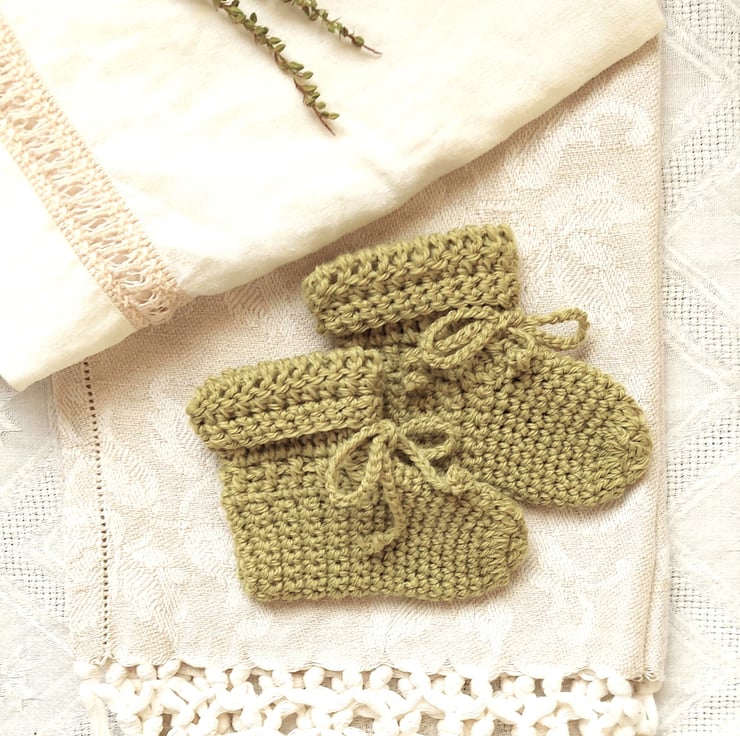 All little feet are different in size and length. Booties need to be comfortable and not restrict your baby's feet. Please note that the measurements are only a guide, due to the different tension of the yarns and the individual crocheting of each unique handmade creation. The wool stretches by 1 cm approx. Can fit from newborn up to 4-6 months, depending on individuals.