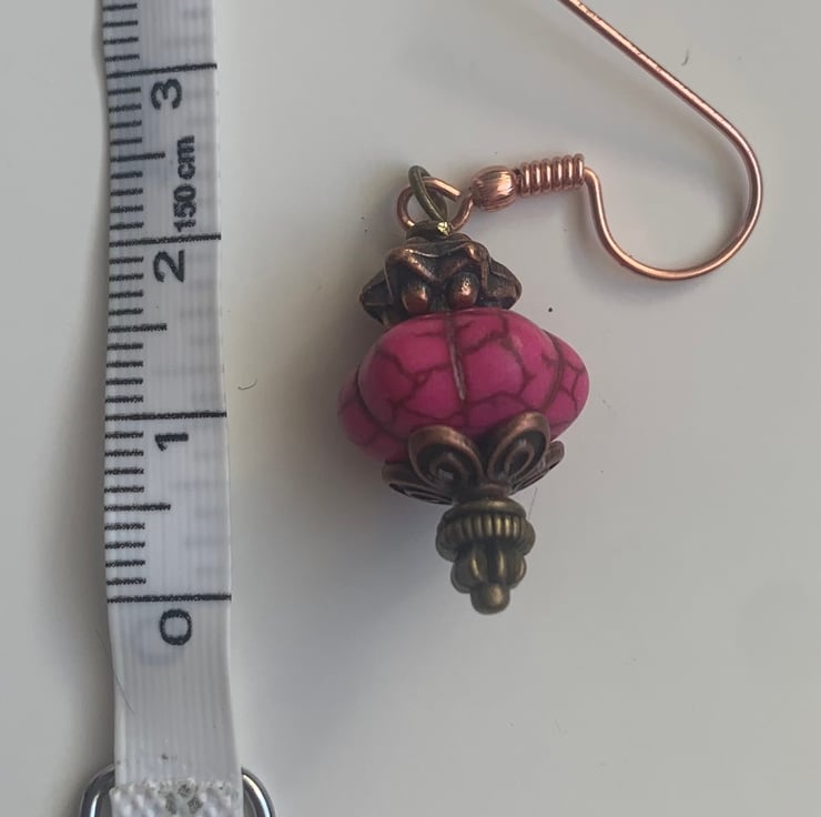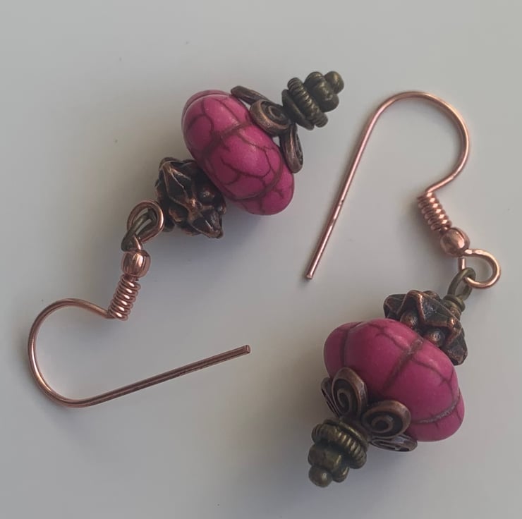 Beautiful cerise pink Howlite beads shaped as pumpkins, with floral copper tone beads create these pretty dangle earrings. Although chunky, they are light and comfortable to wear