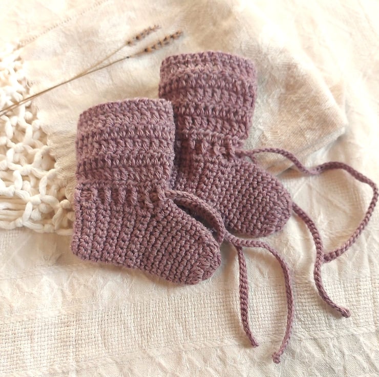 All little feet are different in size and length. Booties need to be comfortable and not restrict your baby's feet. Please note that the measurements are only a guide, due to the different tension of the yarns and the individual crocheting of each unique handmade creation. The soft wool stretches by 2 cm approx. Can fit newborn up to 6 months, depending on individuals.