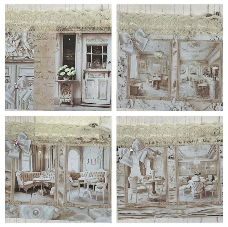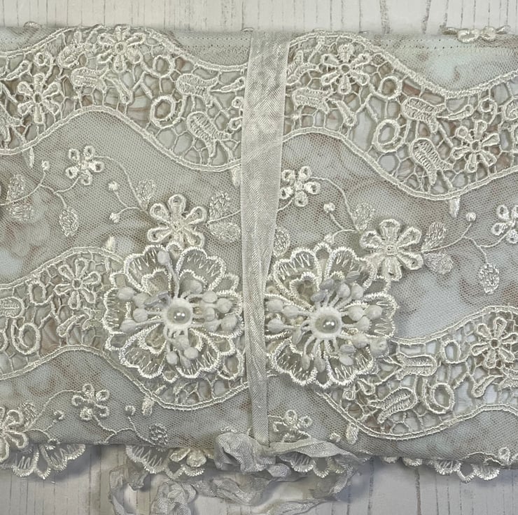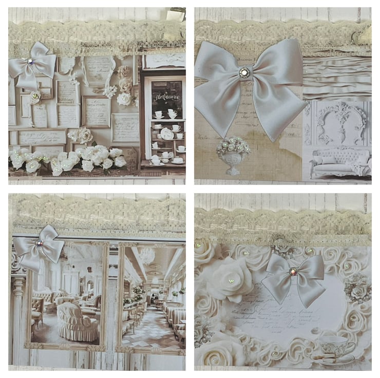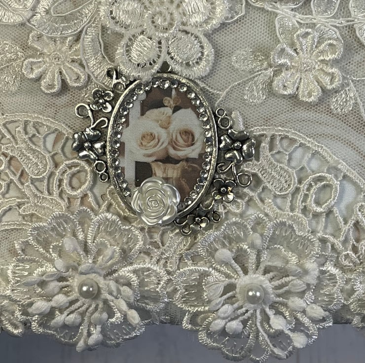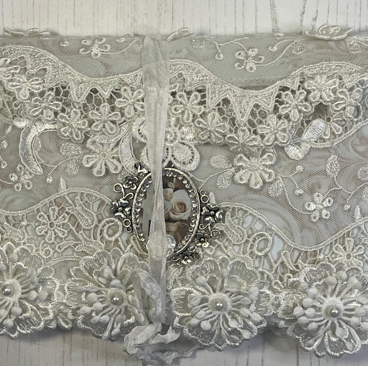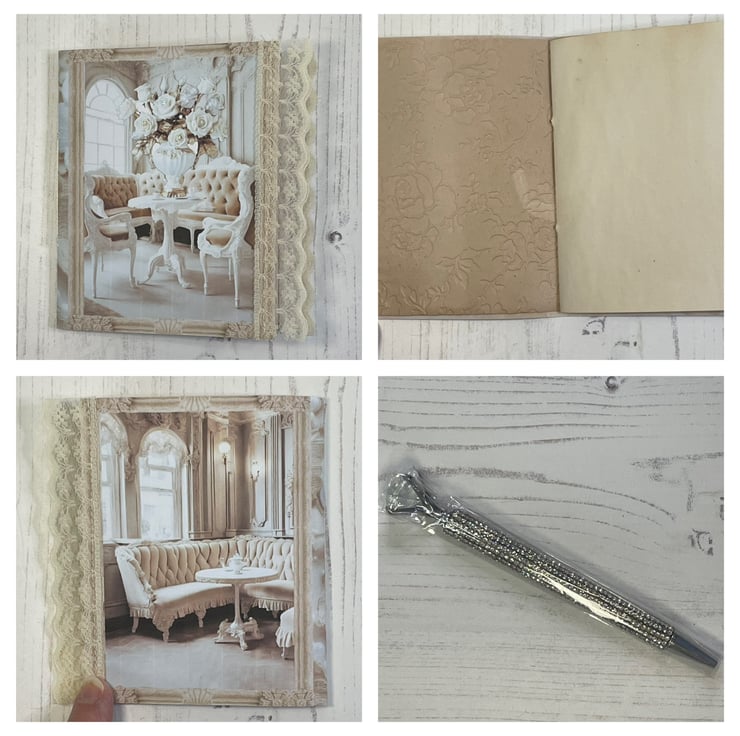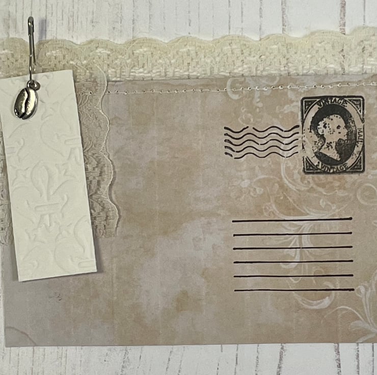 Shades of taupe, white and cream . Designs printed onto fabric and stitched onto a recycled padded envelope. Decorated with lace, appliqués and a cameo. Closure a crushed faux silk ribbon. Contains 8 postcards each decorated with lace, fussy cuts, diamanté, hand stamped with a postcard design. Embossed strip of paper added to lace with a silver coffee bean to embellish. Mini journal with coffee dyed paper pages. A silver sparkly pen with faux diamond top also included.