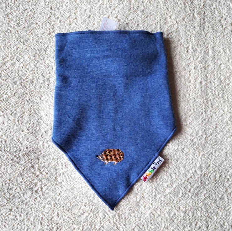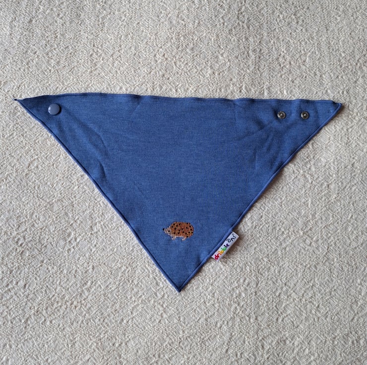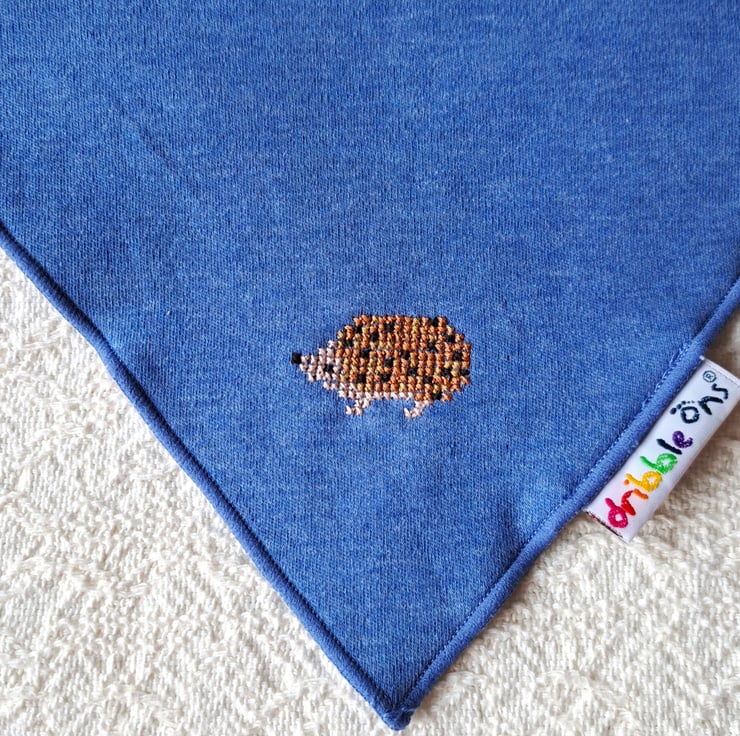 I have hand embroidered a sweet little hedgehog on the lower point of a denim-blue triangular bib. The bib is adjustable, having two press studs at the back of the neck. The front is 100% cotton, and the back is white cotton polyester towelling. It can be machine washed.