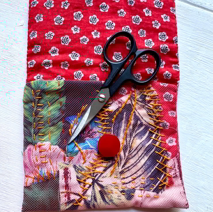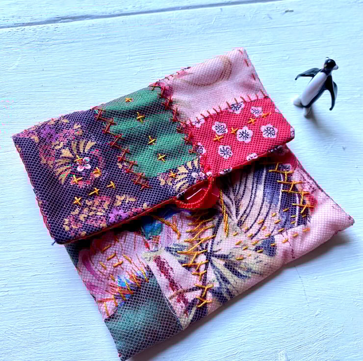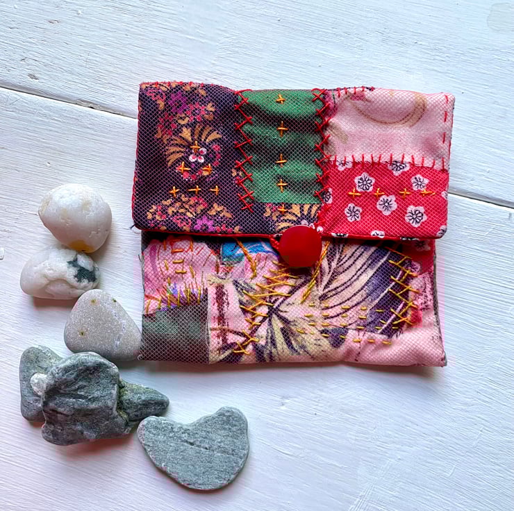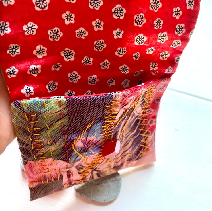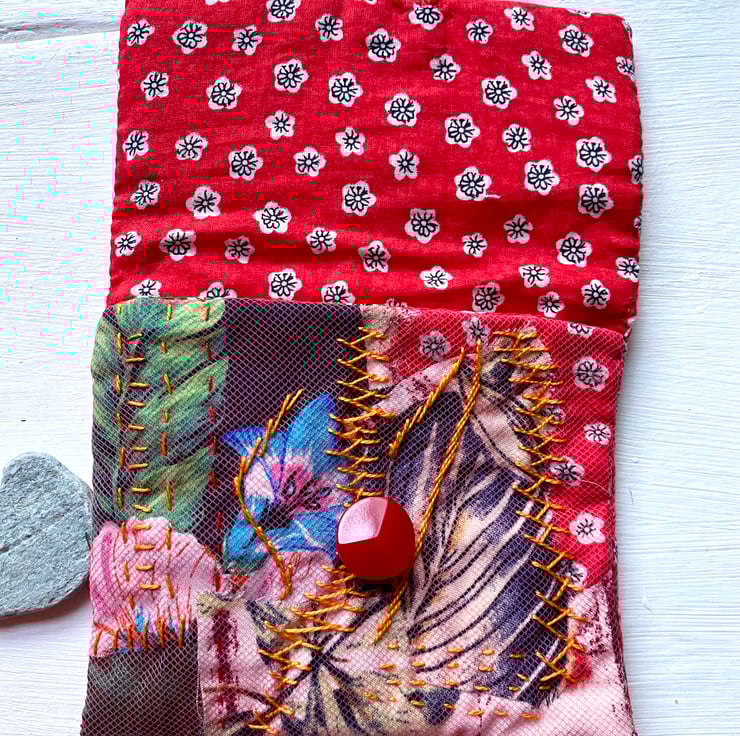 This purse fastens with a button and buttonhole stitched loop and is fully lined. Pieced together with hand stitching it has been covered with fabric netting and embellished with hand stitching.