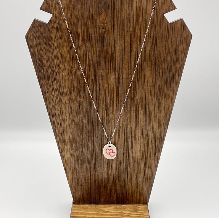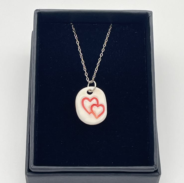 This is my cute oval handcrafted porcelain pendant on a sterling silver chain is embossed with a red entwined heart design.