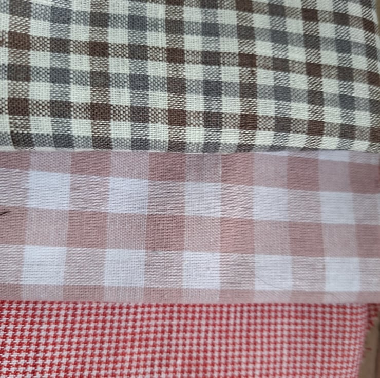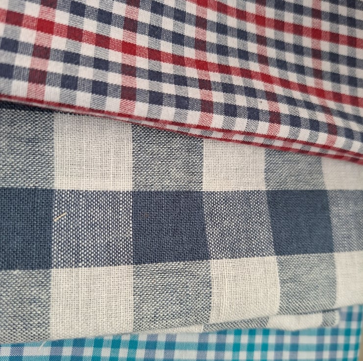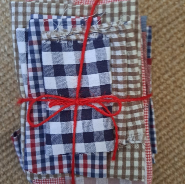 A hearty and homespun bundle of 12 fabrics, largely gingham, maybe a check or two sneaking in as well. Some cotton, some linen, mostly repurposed and all ready for a new life in your next textile project.