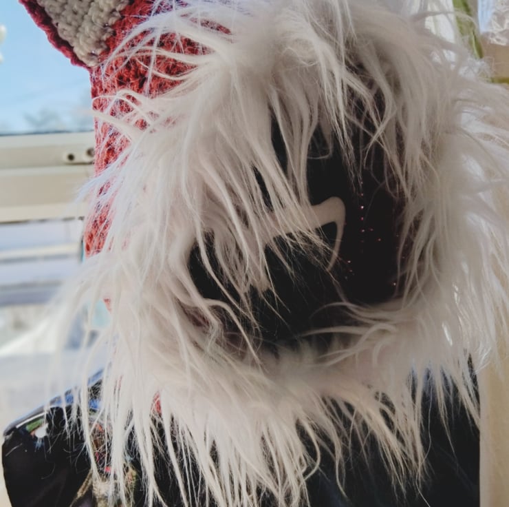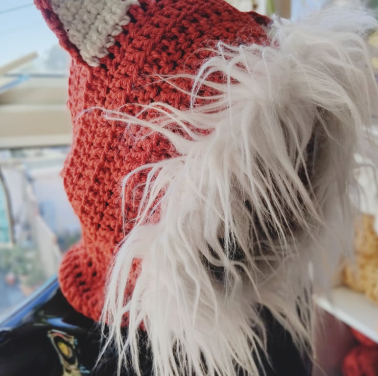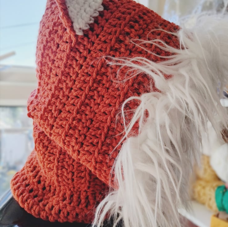 The hood has upright fox ears lined in white and a white faux fur trim around the face.