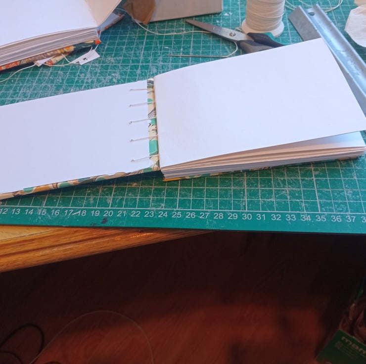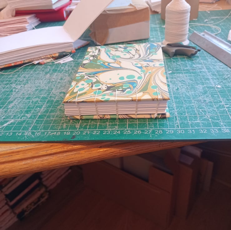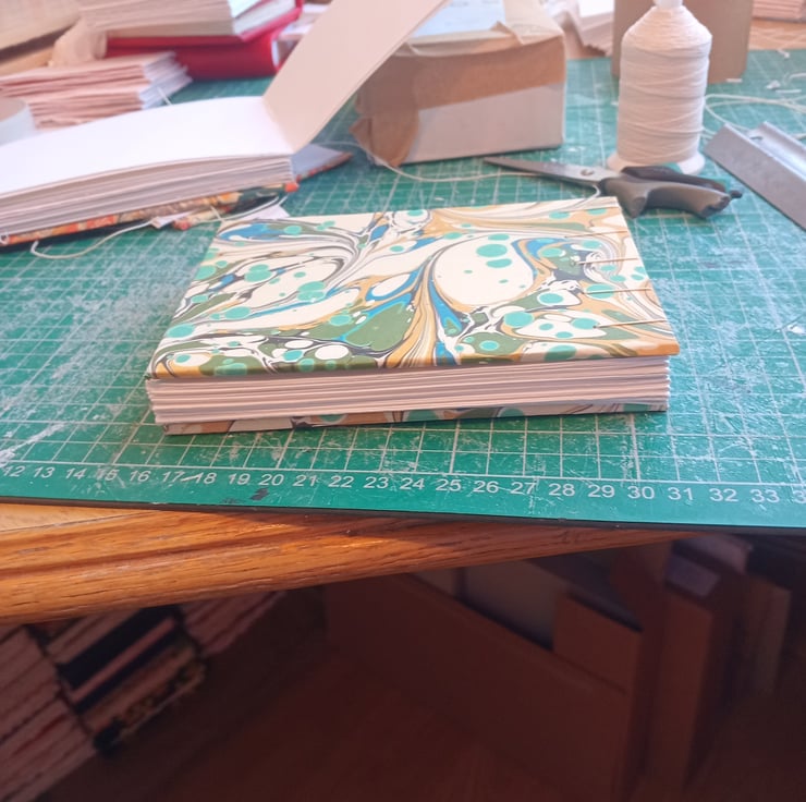 A6 portrait indian cotton paper sketchbook. Smooth texture, Coptic stitch. Printed marbled cover.