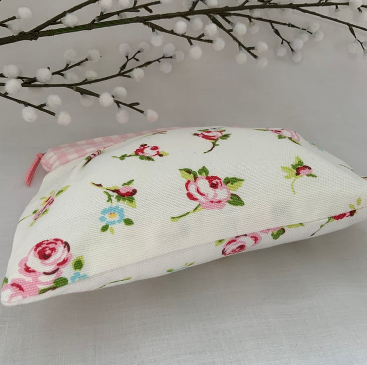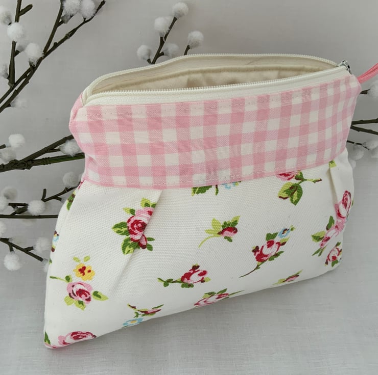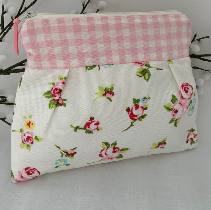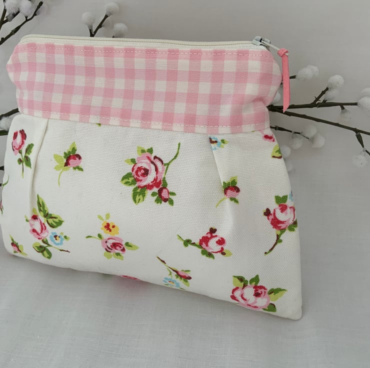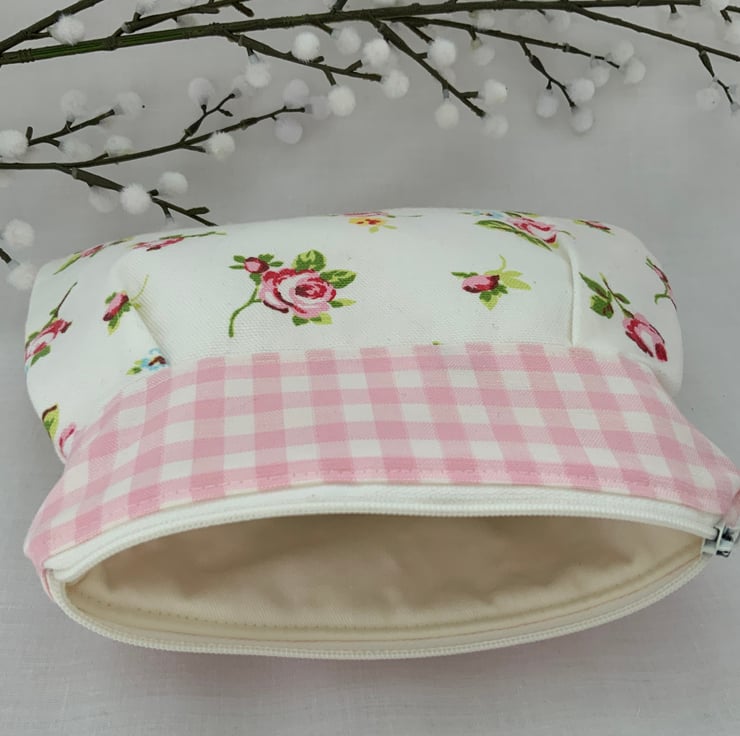 Pretty pleated zipped cosmetic purse / make up bag and matching tissue holder. Made from 100% cotton combining pink gingham and floral fabric. It is lined with cream cotton with bonded interlining which gives it a little structure.