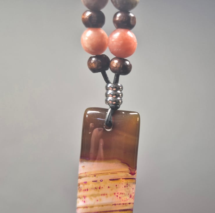 Red brown agate oblong pendant on black cord with matching beads and brown wooden spacers.