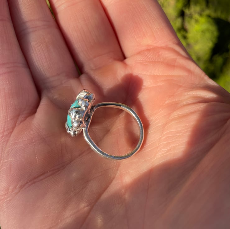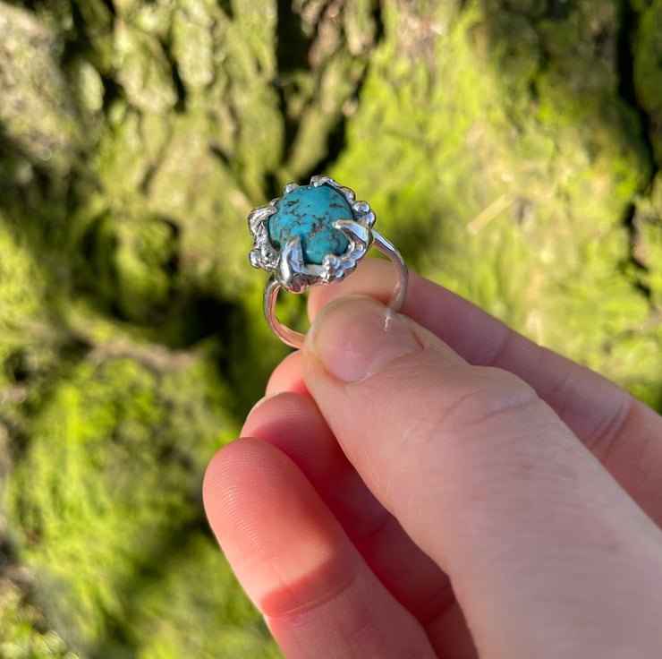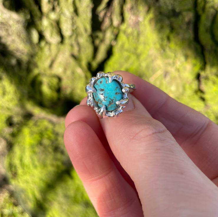 It has been soldered to a lightly hammered ring band - with a twist! It’s a chunky one but not heavy and very comfortable to wear.
