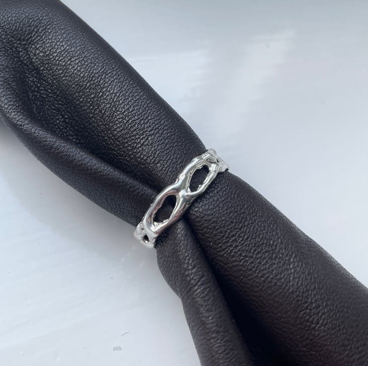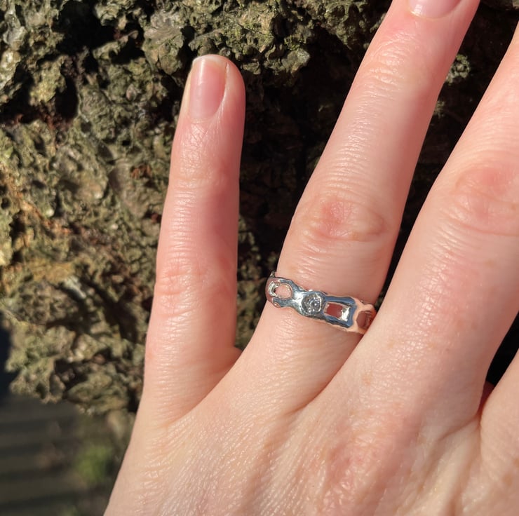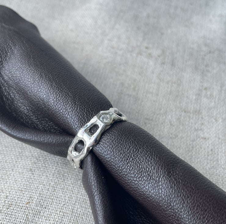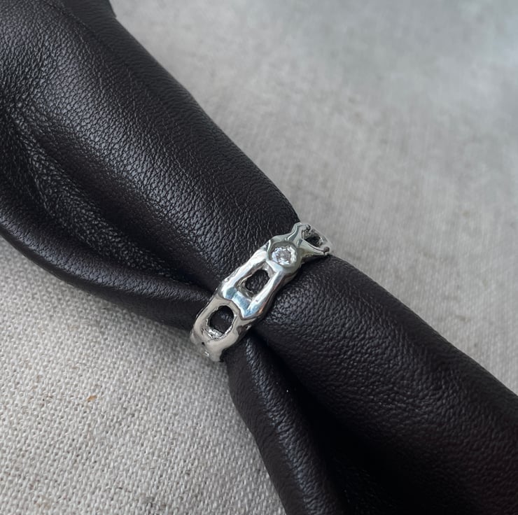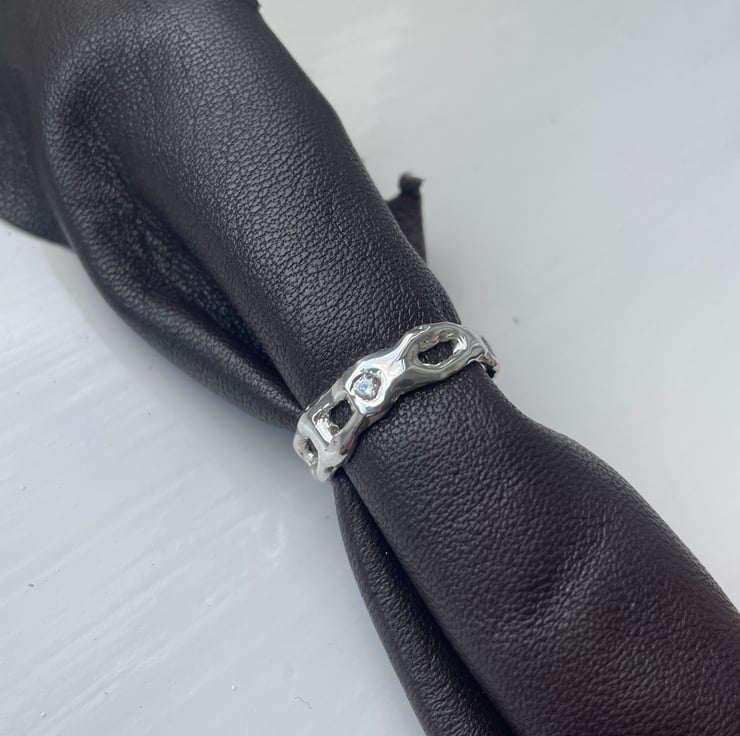 An organic form which also reminds me of chain links, merged together. A small, clear cubic zirconia has been set in between the links for that extra sparkle.