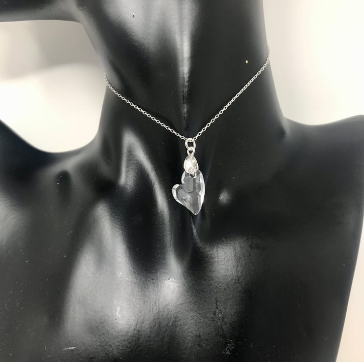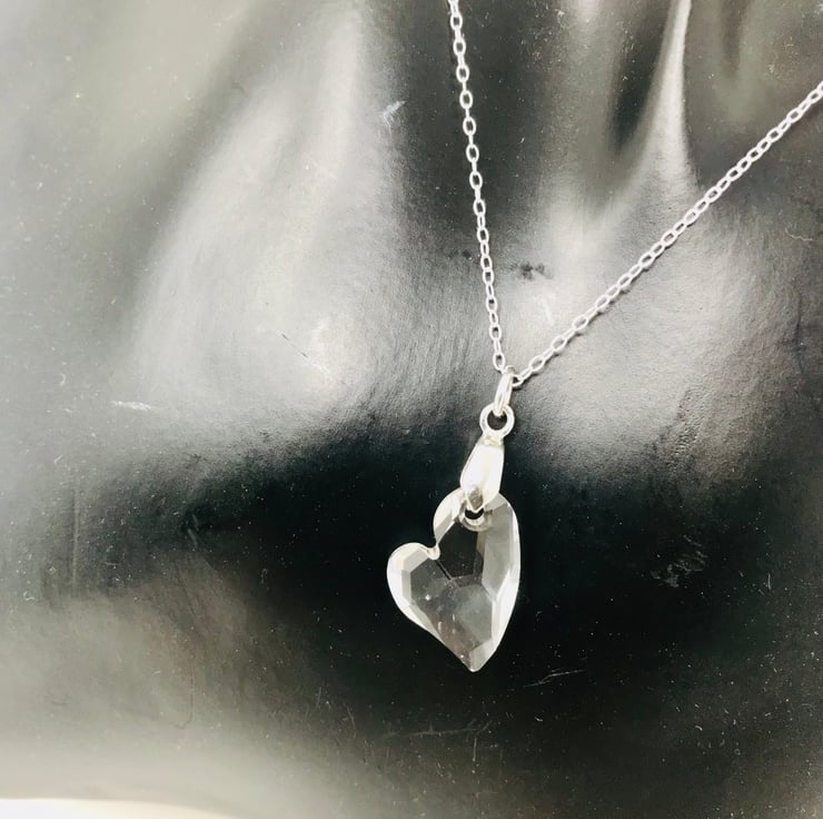 Beautiful Crystal Heart necklace, clear color, silver bail, silver trace chain (45cm). Asymmetrical shape.