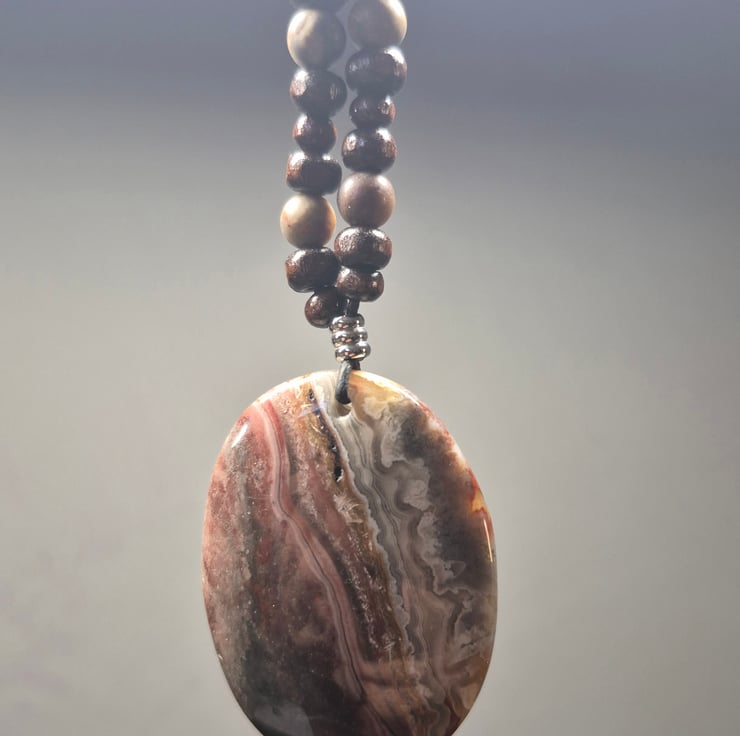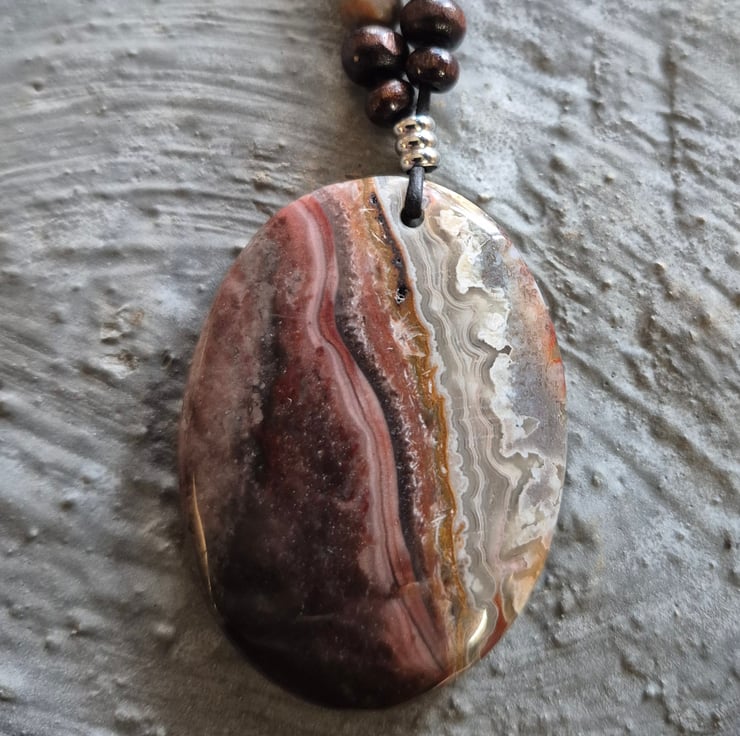 Stunning Mexico crazy lace oval pendant on black leather cord, with matching matt beads and wooden spacers. stainless steel connector and sliders.
