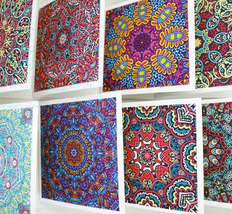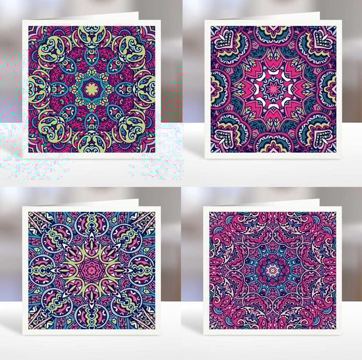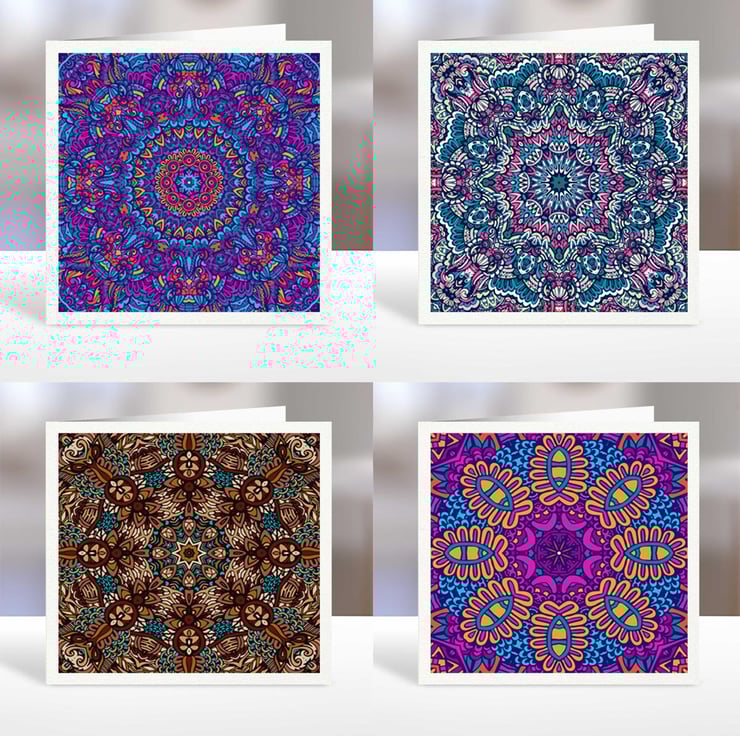 Ten beautiful pearlescent cream blank note cards with colourful mandala designs.
