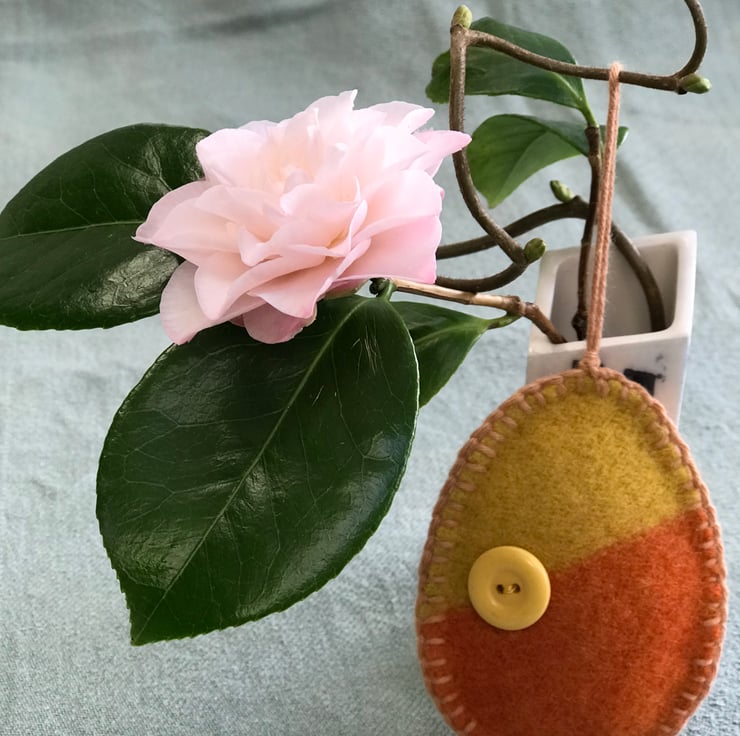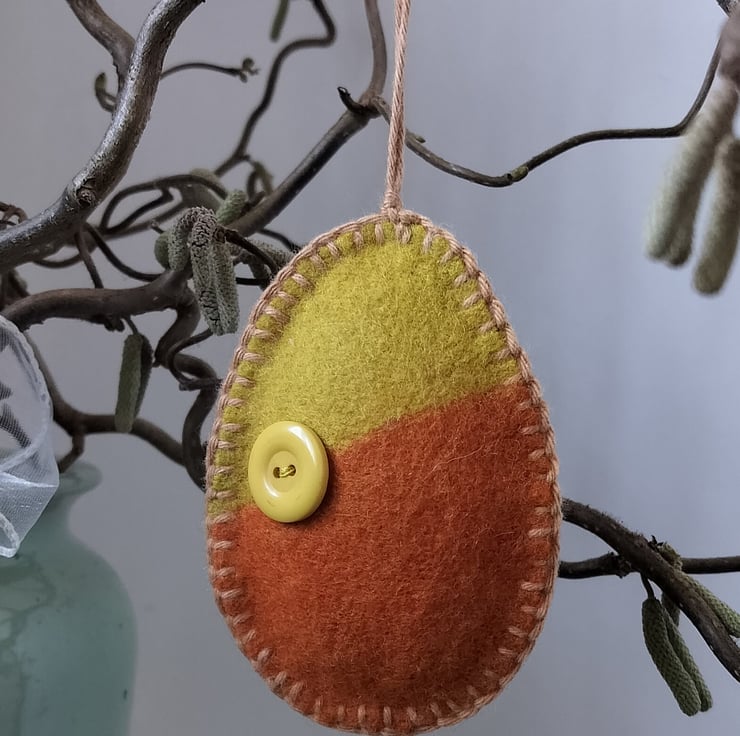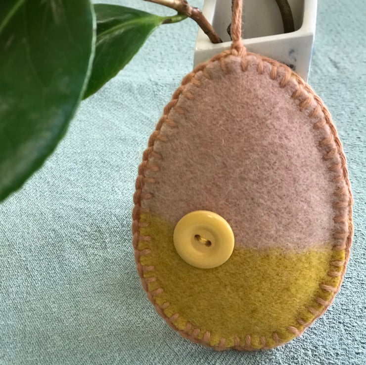 Easter decoration made from an upcycled jumper, filled with wool and hand blanket stitched. The buttons are vintage from my grandmother's button box.