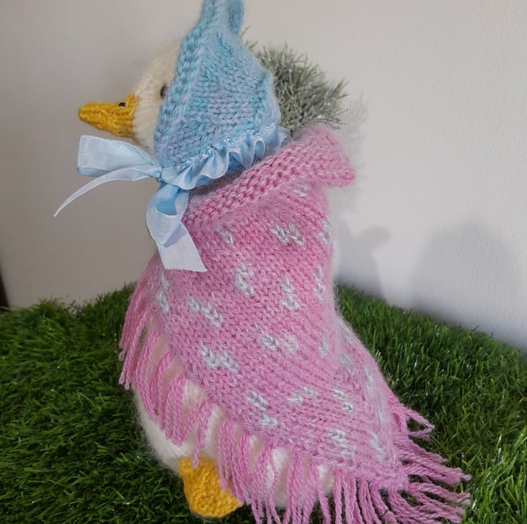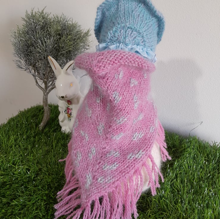 She is knitted in soft alpaca yarn with kid silk mohair. Her shawl is hand embroidered and her blue bonnet tied with a pretty blue ribbon.