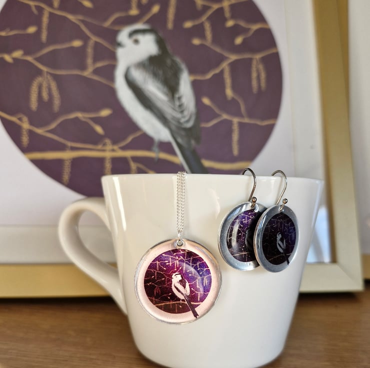 Aluminium and Sterling Silver pendant, approximately 31mm in diameter. The disc is made from aluminium and has had a print of an original artwork by Hannah MacIver transferred on to it, and then sealed in UV resin. Sterling silver chain.