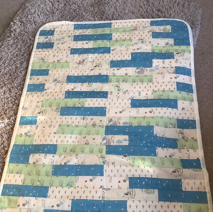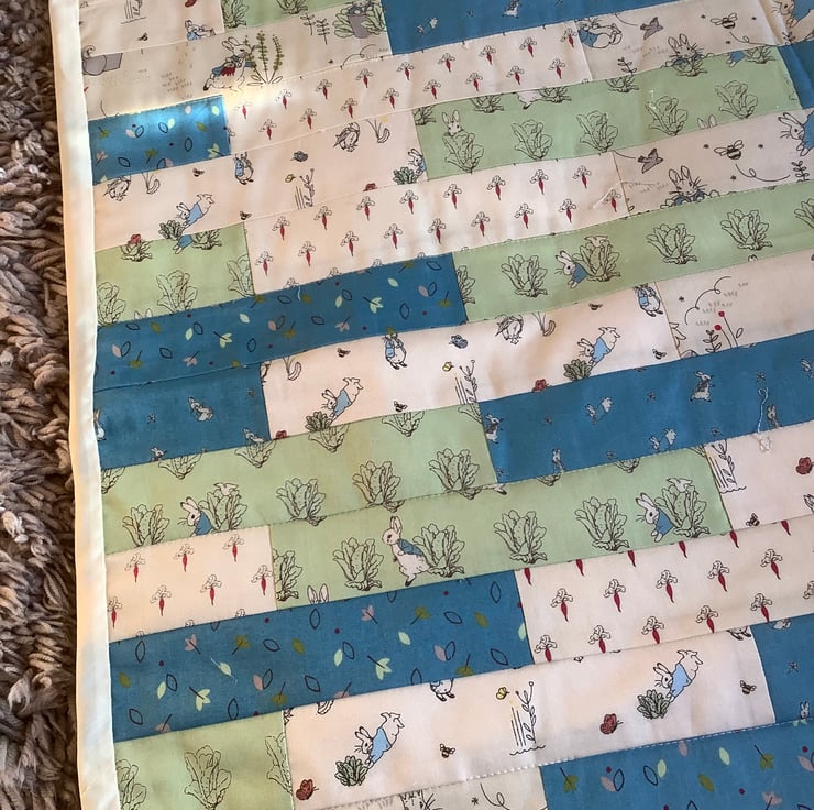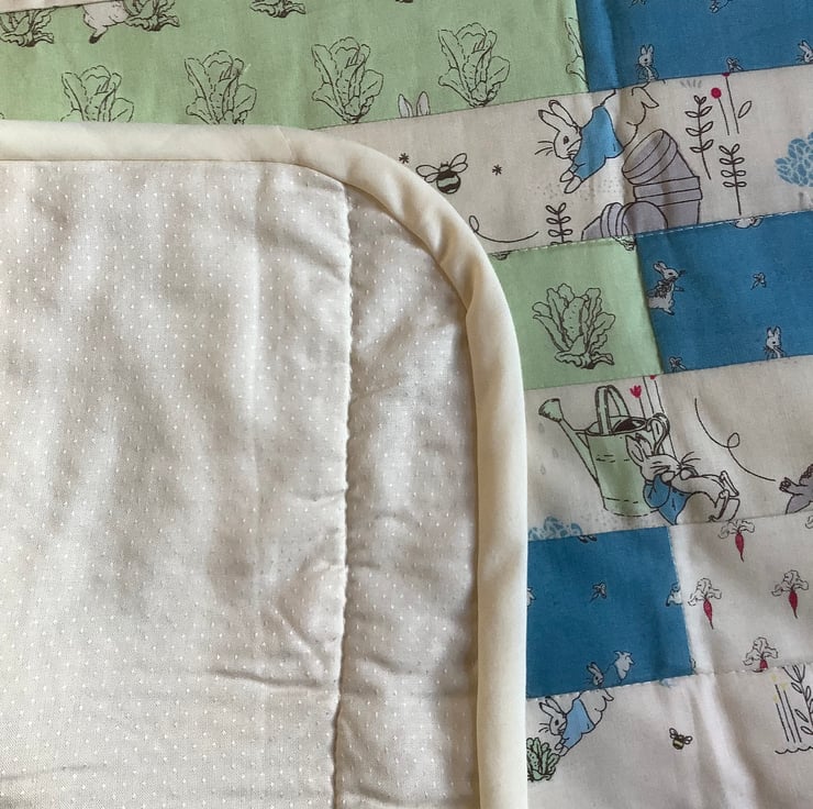 Peter rabbit themed patchwork quilt. Lightweight and measuring 117cm x93cm (45”x37”). Backed with a pretty silky cream fabric and coordinating cream edging.