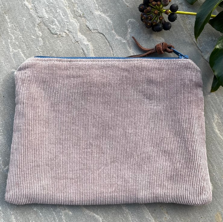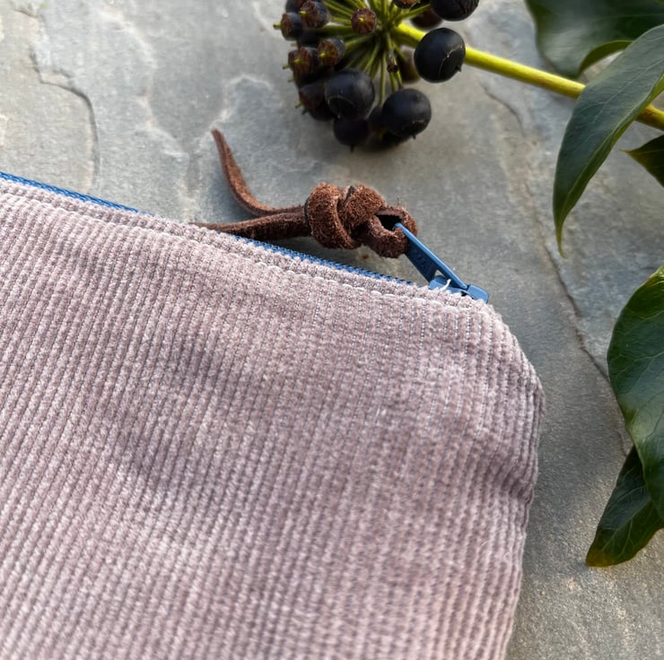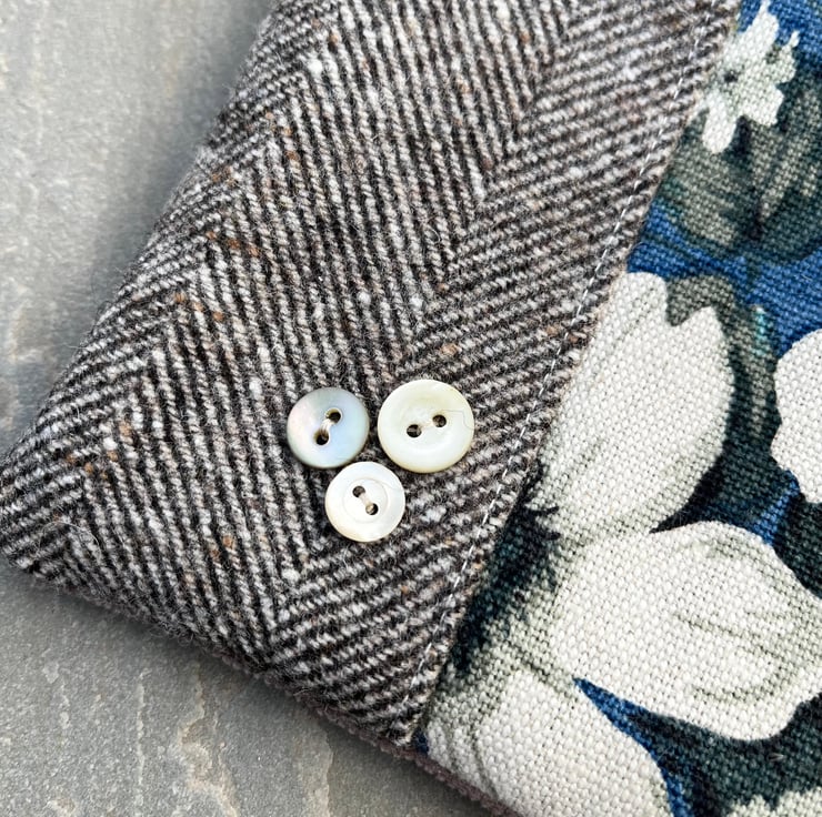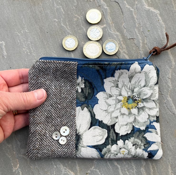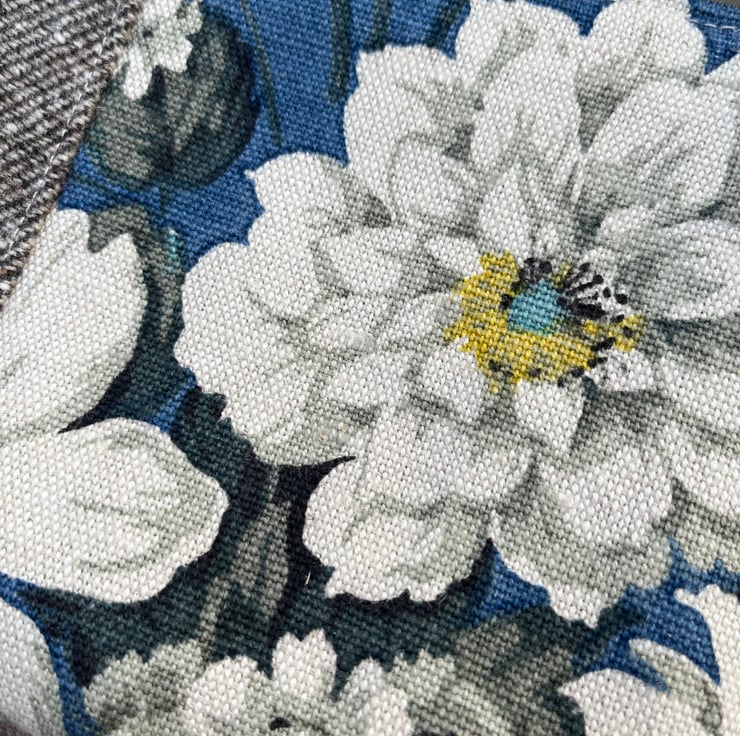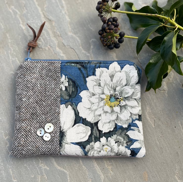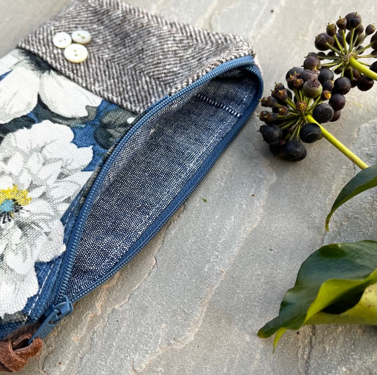 One of a kind pouch made from vintage and reclaimed fabrics. A small piece of old Sanderson floral linen mixes with a sample swatch of herringbone wool on the front. The back is a soft piece of needlecord taken from a skirt. The pouch is lined with reclaimed cotton curtain fabric in soft denim blue.