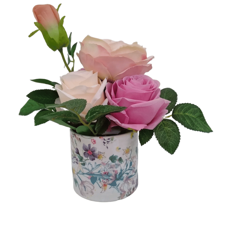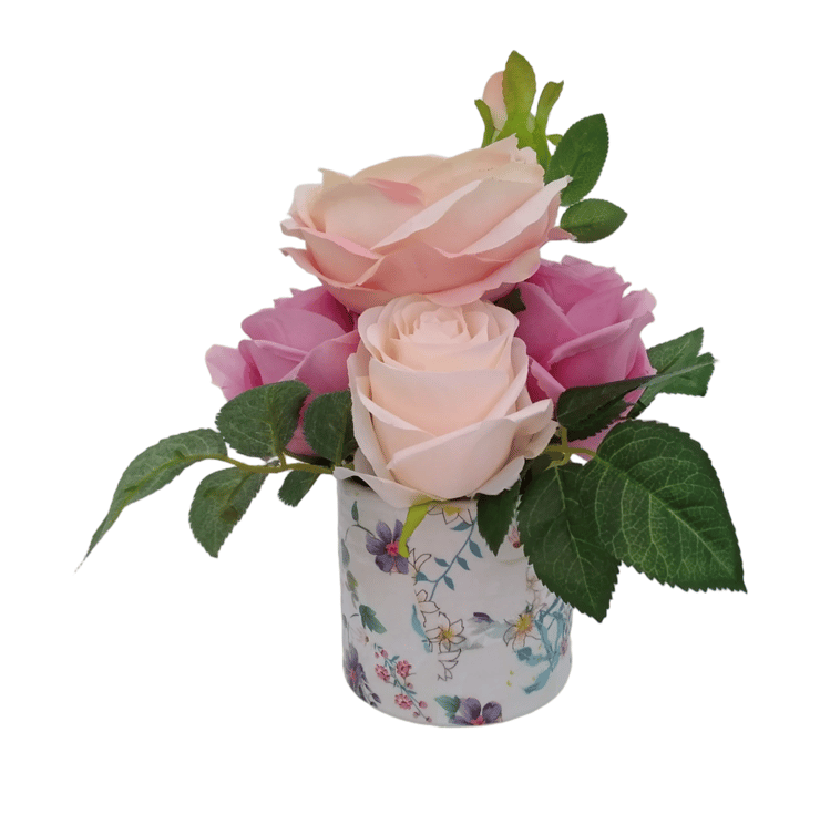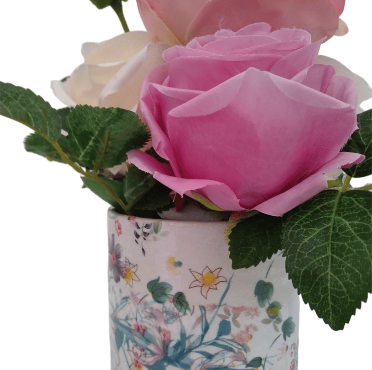 The plant pot was once just an ordinary item, but through the delicate art of decoupage, I gave it a new life with a beautiful floral design. I love how this technique allows me to transform old or forgotten things into something truly special. Pairing it with blush pink English roses and soft pink silk roses, I wanted to create a piece that feels romantic, vintage, and elegant—I hope you love it as much as I did creating it.