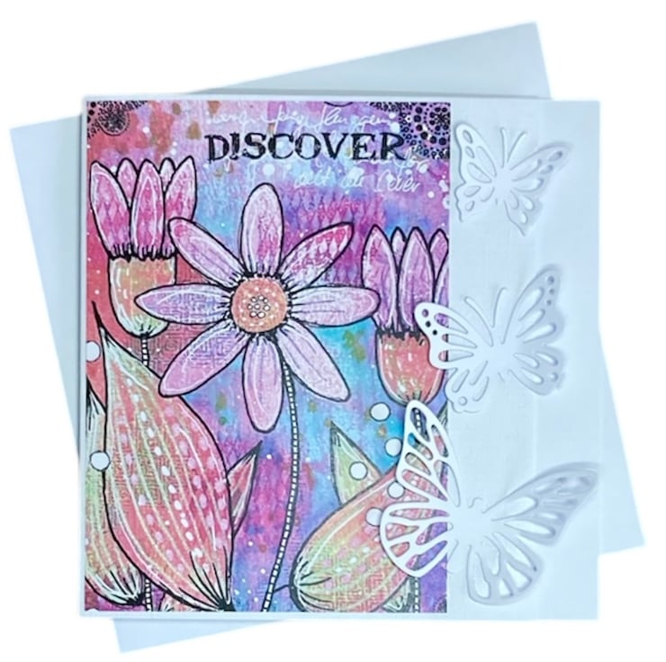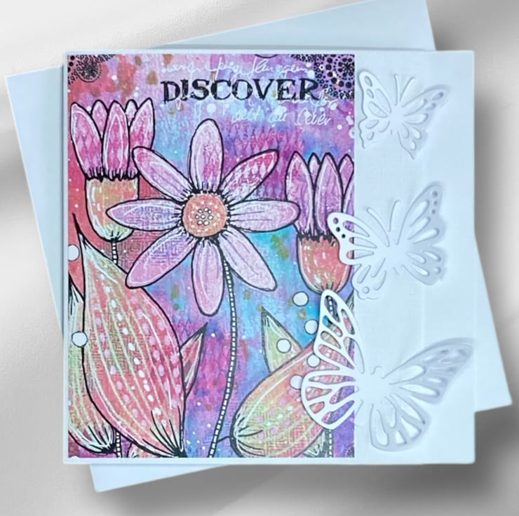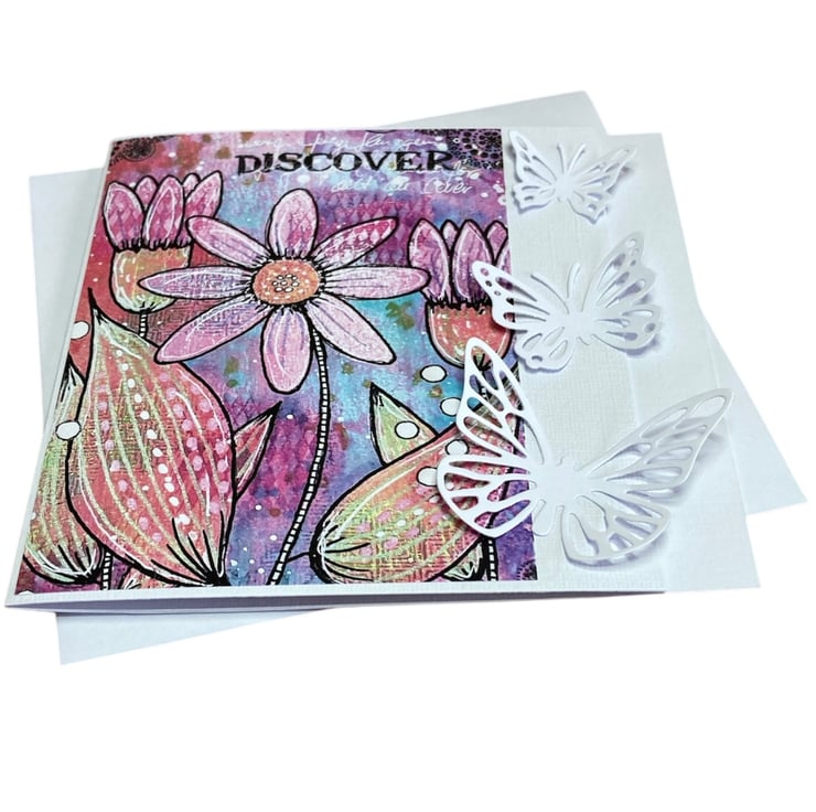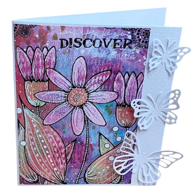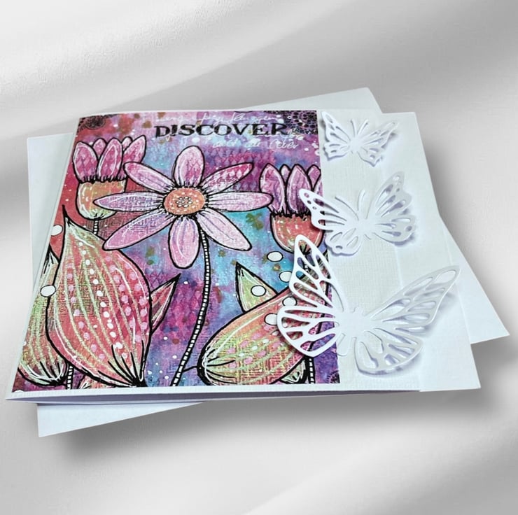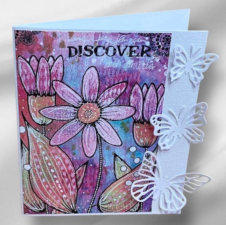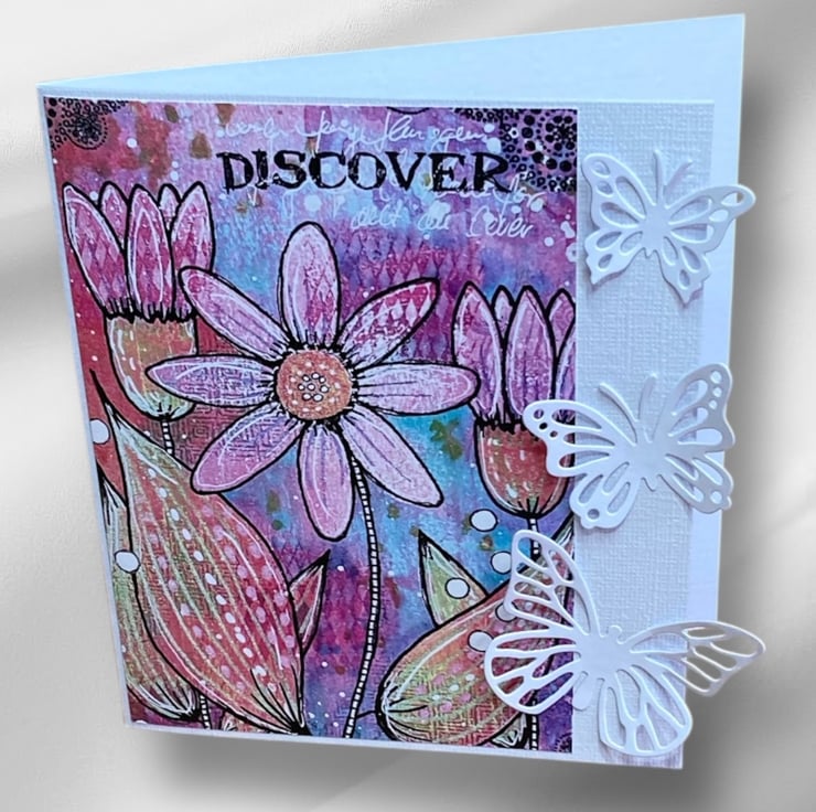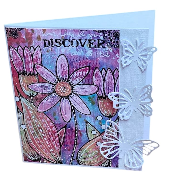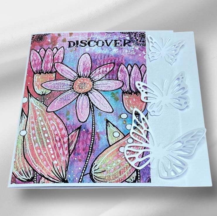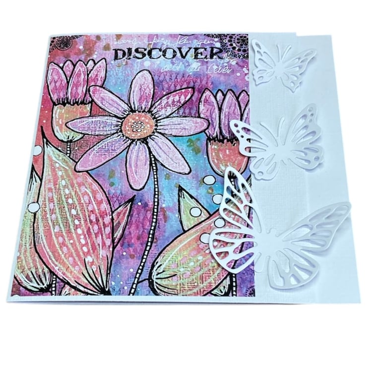 A gorgeous floral abstract design paper in hues of purples, pinks and blues has been layered onto a white linen card base. Three die cut butterflies have been added.