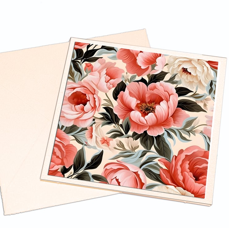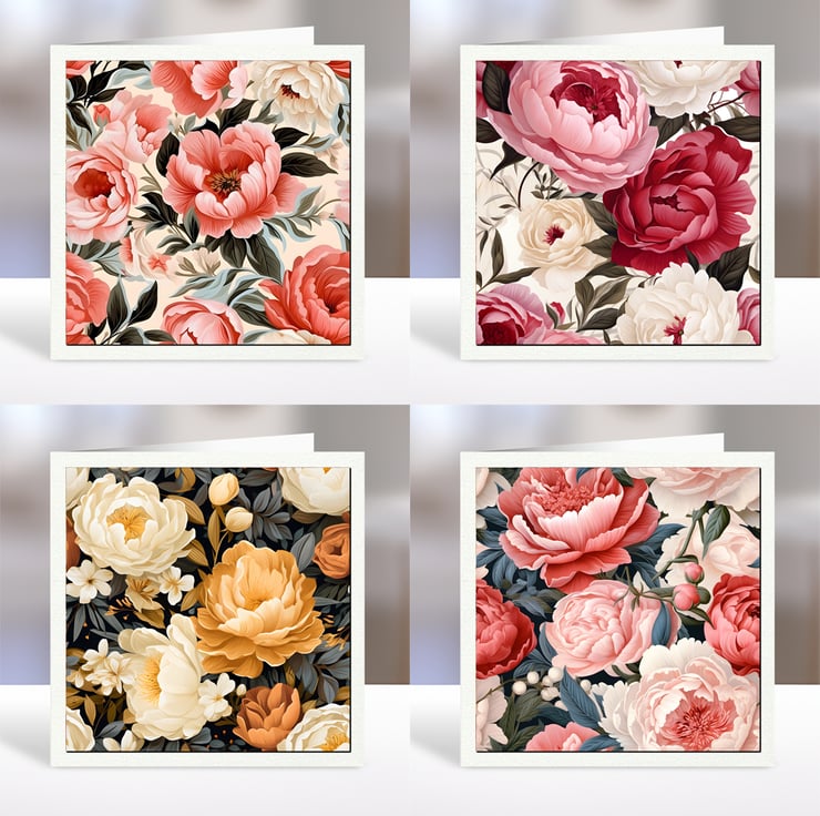 This is a beautiful set of 8 blank pearlescent cream note cards with peony flower patterns.