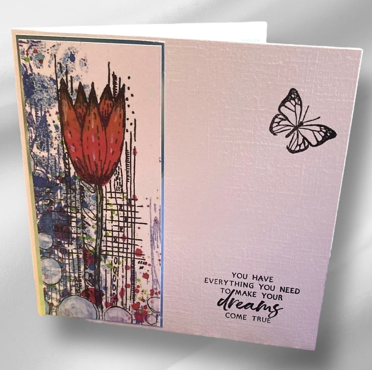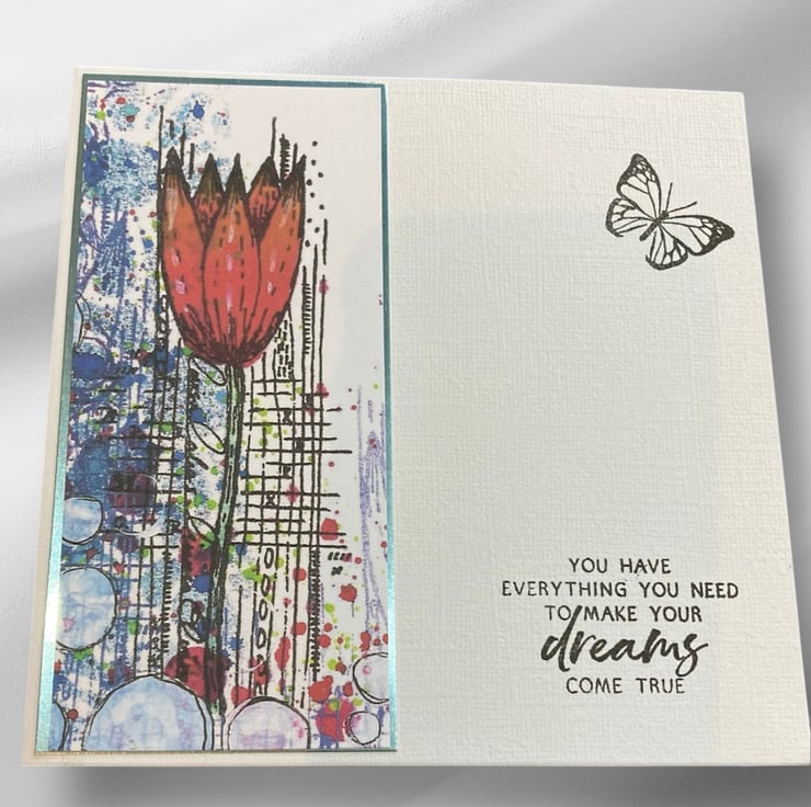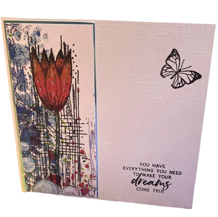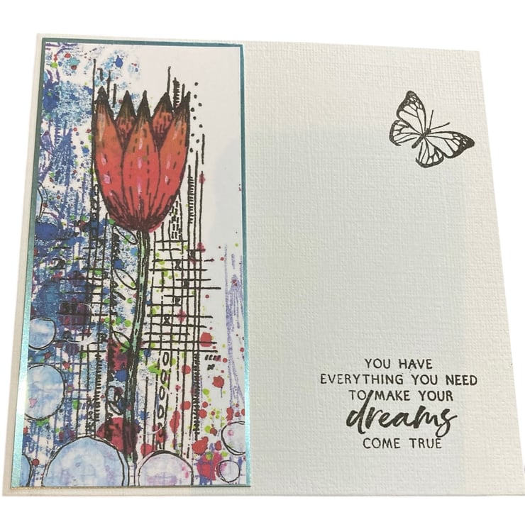 This abstract card has a white linen base which has been layered with blue mirror card and a card printed with a butterfly and floral design in reds, blues and purples. The card had been hand stamped with the words You Have Everything You Need To Make Your Dreams Come True and a butterfly.